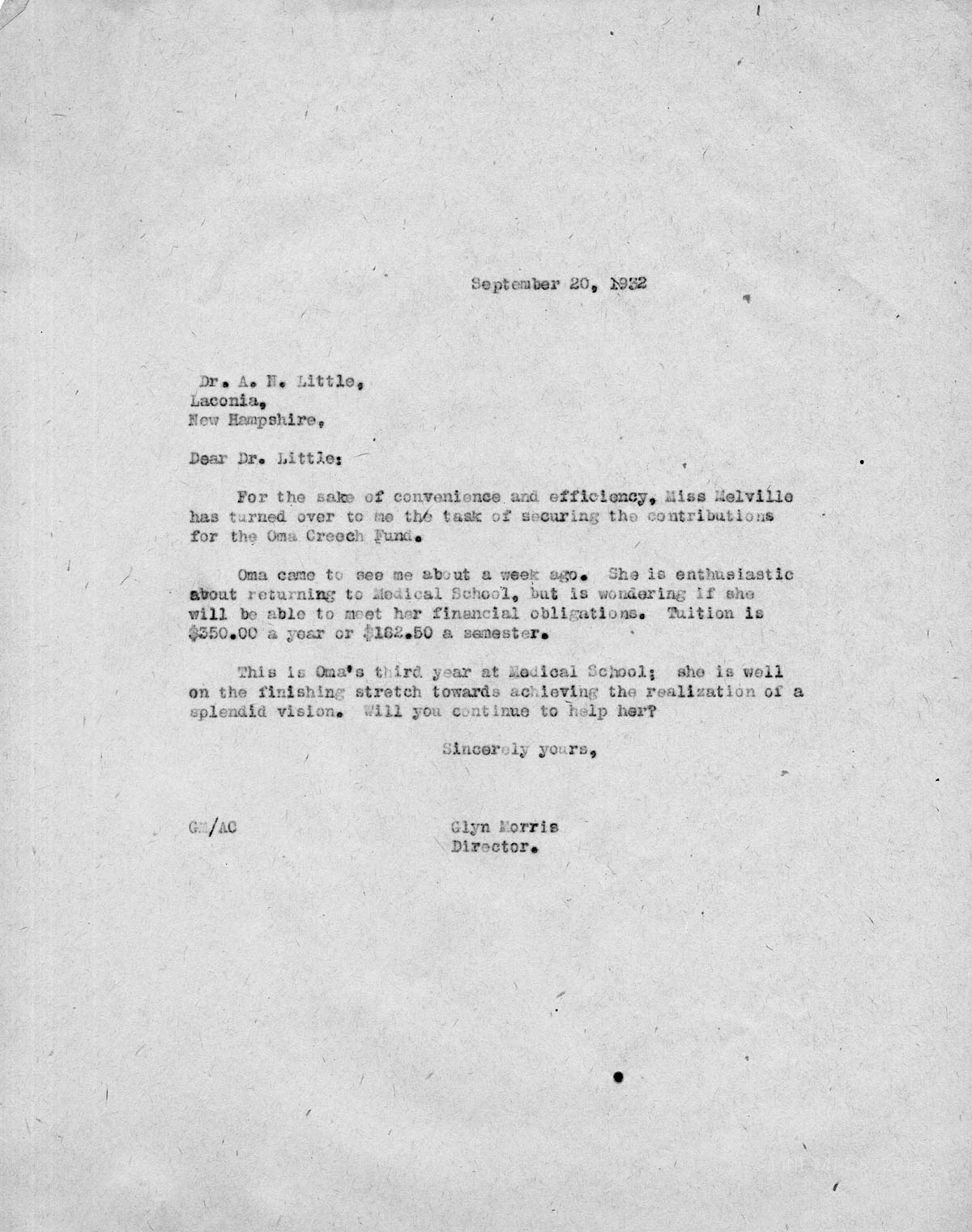 TAGS: Glyn Morris 1932-34 correspondence, Oma Creech, medical schools, Oma Creech Fund, fundraising letters from Glyn Morris, Berea College