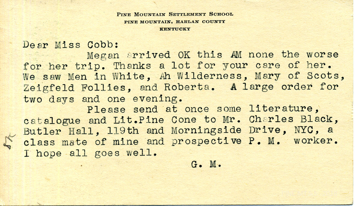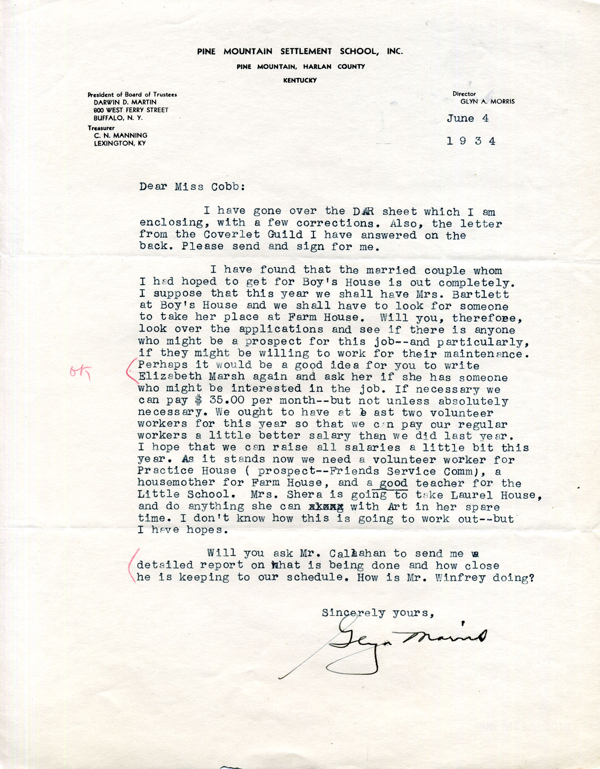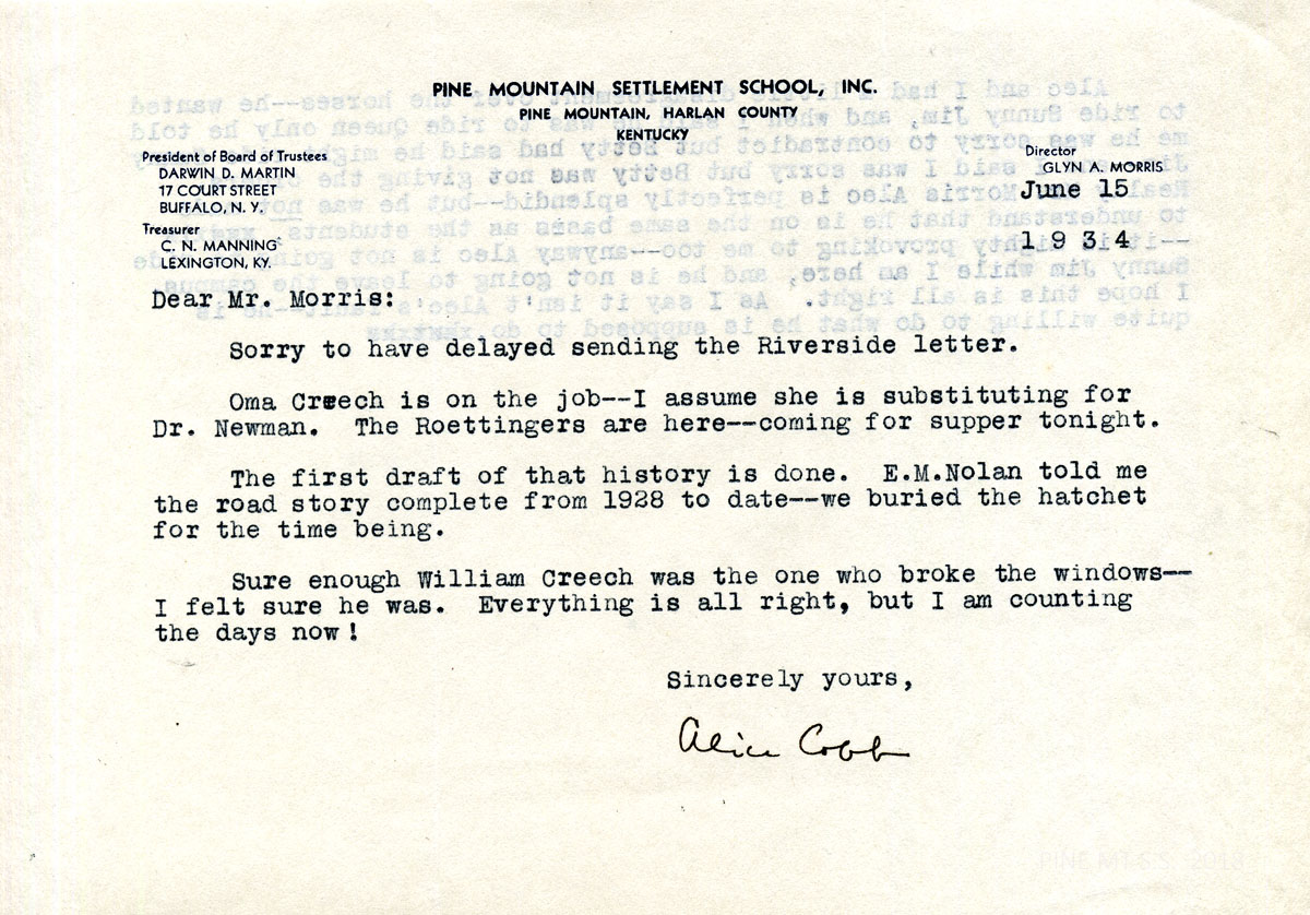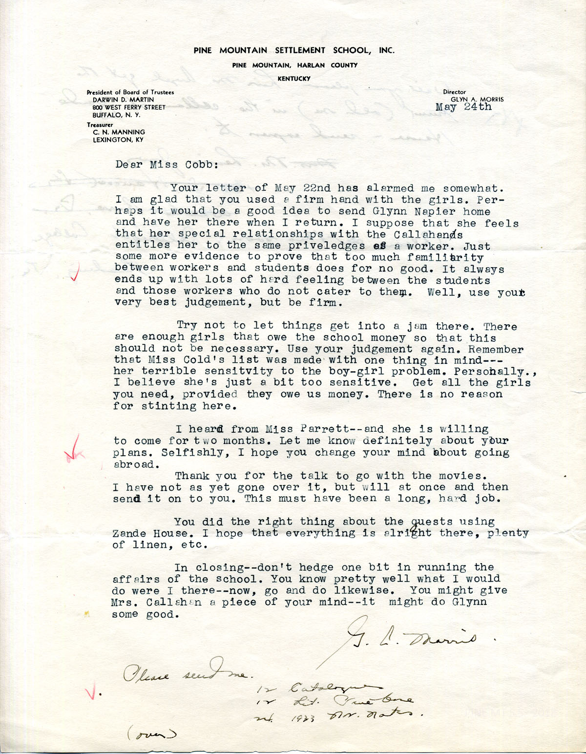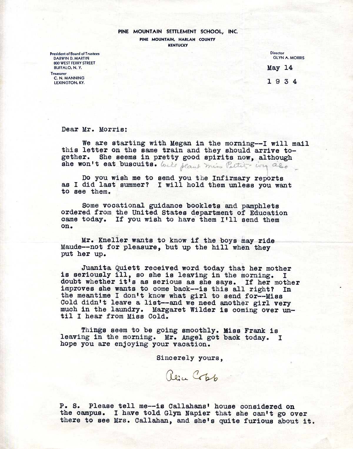 In 1934 Glyn Morris took an extended leave from the Pine Mountain Settlement School campus leaving Alice Cobb, his secretary, in charge. The following correspondence between Morris, Cobb, and others reveals the day-to-day activity and concerns of the campus in 1934 as handled from afar.