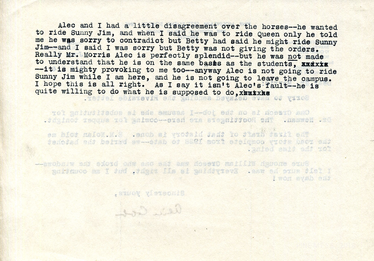 032 June 19, [no year]. To Cobb from “G.M.” [Morris], who encouraged Cobb in her dealings with Alec. “Alec is to be considered as a student, and you can tell him I said so again if you wish….I certainly made it clear to the Newmans…that I felt it best for him to be under the same rules as the students.”