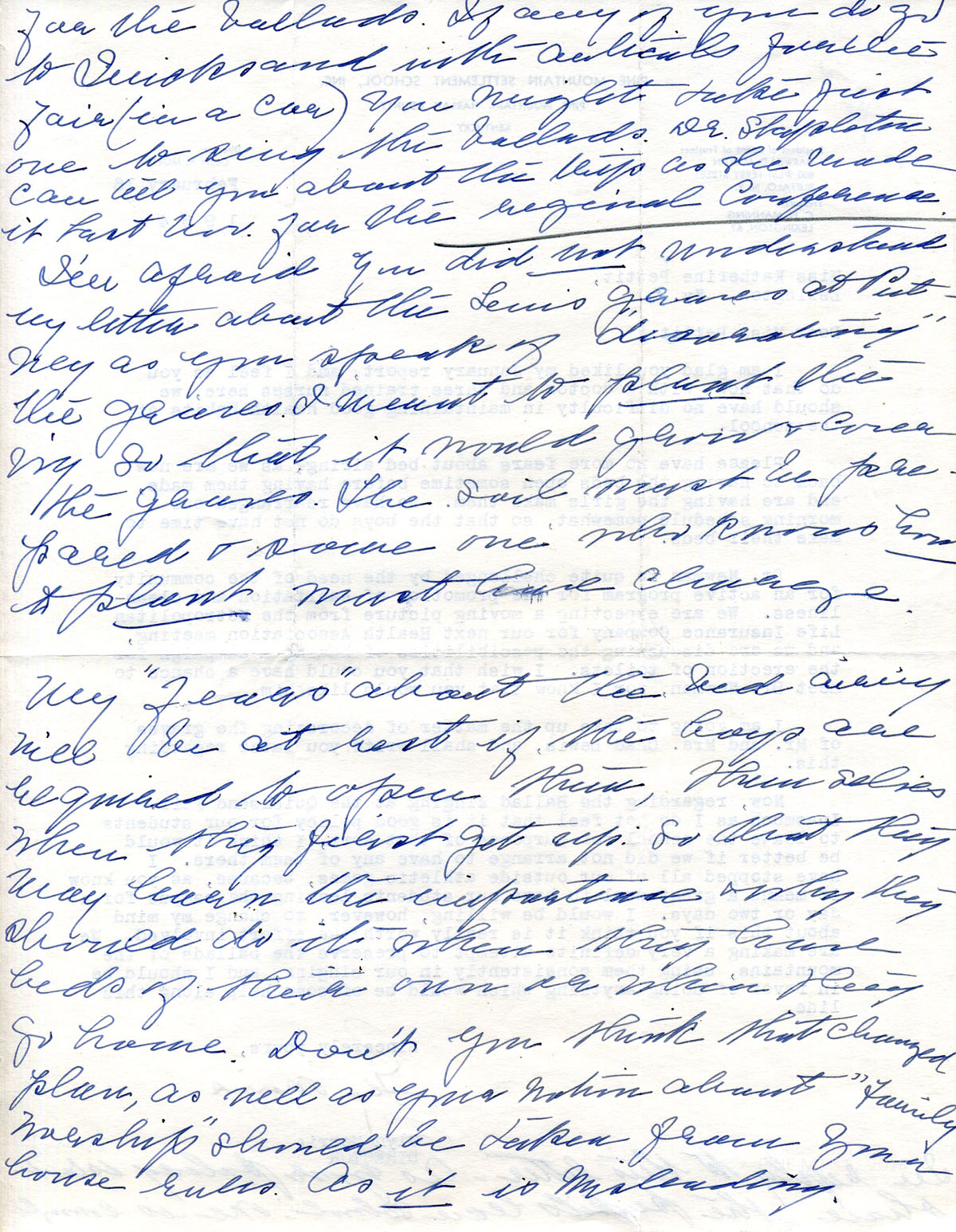 002-002a February 16, 1934. [002] To Katherine Pettit t, Lexington, KY, from Glyn Morris, PMSS Director. Responding to her letter, he writes about a doctor and three trained nurses, bed airing and making, Dr. [Frank W.] Newman’s program to promote sanitation and cleanliness, decorating graves of Mr. and Mrs. Chad Lewis. He objects to ballad singing at the Quicksand Fair, because “I do not feel that it is good policy for our students to leave the school for purposes of that sort….I have stopped all of our outside athletic games, because…it means a great deal to have our students leaving the campus for a day or two days.” He assures her that “we are making a very definite attempt to preserve the ballads of the mountains….” [At the bottom of this page begins Pettit’s handwritten reply.] [002a] Pettit continues, suggesting taking just one person to sing at the Fair; planting ivy on the Lewis graves at Putney; more about airing beds; removing “family worship” from [?] house rules, “as it is misleading.”