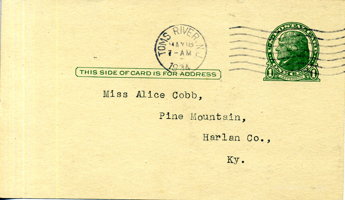 007 Address side of typewritten postcard to Alice Cobb with timestamp of “Tom’s River, NJ, May 18, 1934.” 007a Message side of postcard. To Cobb from “G.M.” [Glyn Morris], reporting that Megan arrived safely. Lists four movies [?] he watched. Asks Cobb to send PMSS literature, catalog and Pine Cone to Mr. Charles Black in NYC, his classmate and a prospective PMSS worker.