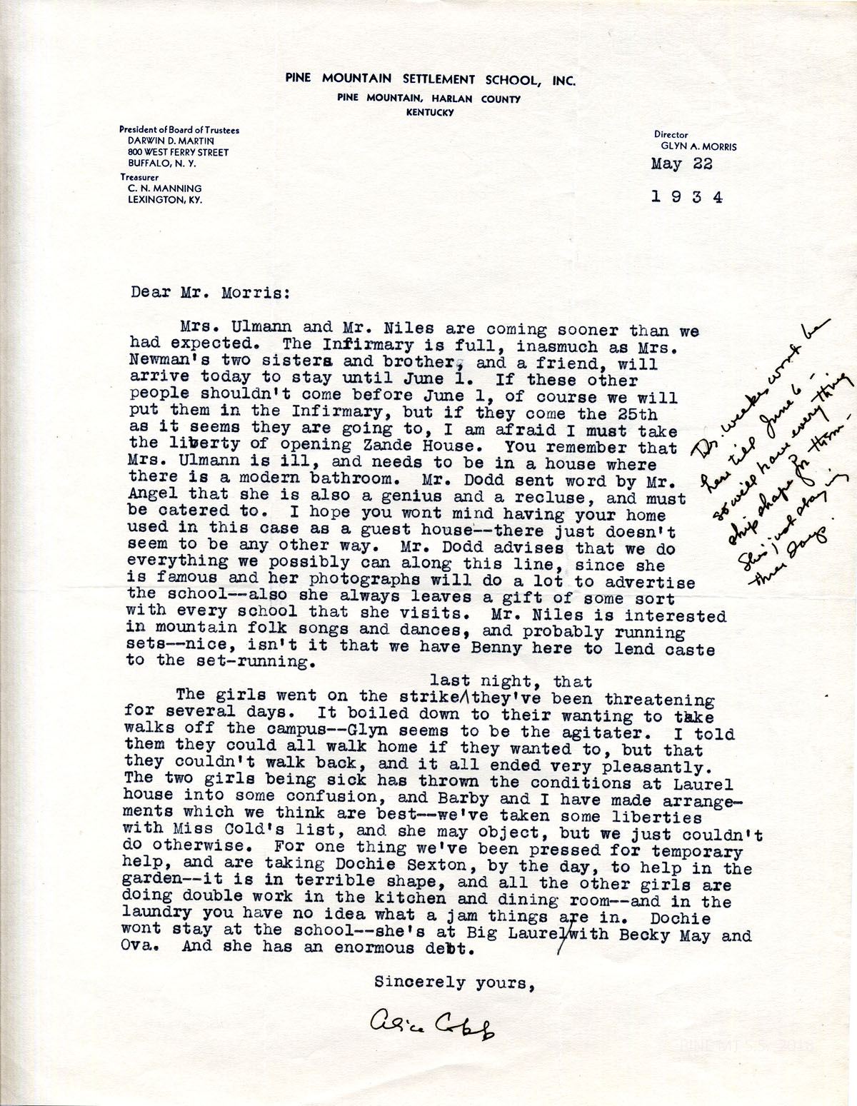 010 May 22, 1934. To Morris from Cobb. Mentions that Mrs. [Doris] Ulmann and Mr. [John Jacob] Niles are arriving early and will be boarded either in the Infirmary or Zande House. She describes Mrs. Ulmann, according to Mr. Dodd through Mr. Angel. “I hope you won’t mind having your home used in this case as a guest house…. Mr. Dodd advises that we do everything we possibly can along this line, since she is famous and her photographs will do a lot to advertise the school–also she always leaves a gift of some sort with every school she visits. Mr. Niles is interested in mountain folk songs and dances, and probably running sets…..” [Handwritten notation in right margin, about Dr. Weekes [?] arriving June 6, and staying 3 days.] Cobb tells of a strike by the girls who want to take walks off campus and how she handled it; how Barby and she are dealing with a reduced number of girls to help in Laurel House; has Dochie Sexton to do the garden work. “Dochie won’t stay at the school — she’s at Big Laurel with Becky May and Ova….”