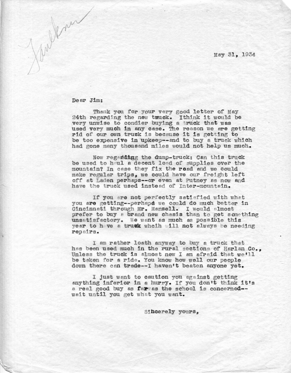 016 May 31, 1934. Carbon copy of a typewritten letter to “Jim” from [unsigned — handwritten notation at top of page: “Faulkner”], thanking him for his May 24th letter about the new truck and advising him not to buy a much used truck. As for the dump-truck, it could be used instead of Inter-mountain to haul supplies from Laden or Putney. Perhaps Mr. Mansell could find a better deal in Cincinnati. “We want as much as possible this year to have a truck which will not always be needing repairs.”