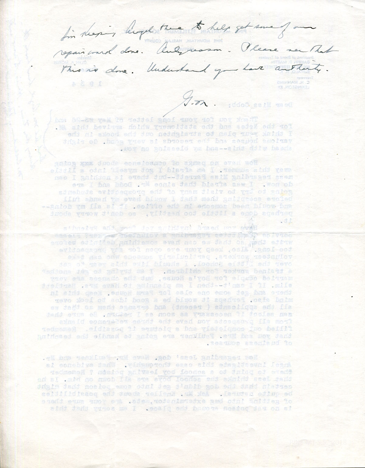019-019a June 1, 1934. Two-page letter to Cobb from Morris, [019] responding to her May 23-26 letter. He agrees with her plan for the books and records. Mentions Miss Parrett; suggests writing the Friend’s Service Committee about a volunteer worker; hopes to have a trained worker for Little School and a married couple for Boy’s House (or Mrs. [Barbara] Bartlett). He tells her to organize the applicants’ papers and that she and Mrs. Faulkner will be teaching the business courses. Morris asks that Mr. Faulkner and Mr. Angel investigate the dog’s poisoning. [Handwritten notation in margin: “Don’t let Mr. Angel bind books. OK during down[?] time. He is to work with the children. This is important.” [019a] Morris adds a response to Mrs. Faulkner’s letter that she wrote to Gladys [Morris] about the girls’ overtime hours. He and Gladys will return June 30. He adds a note to Miss Cobb about bedding to be used by Dr. Weekes.