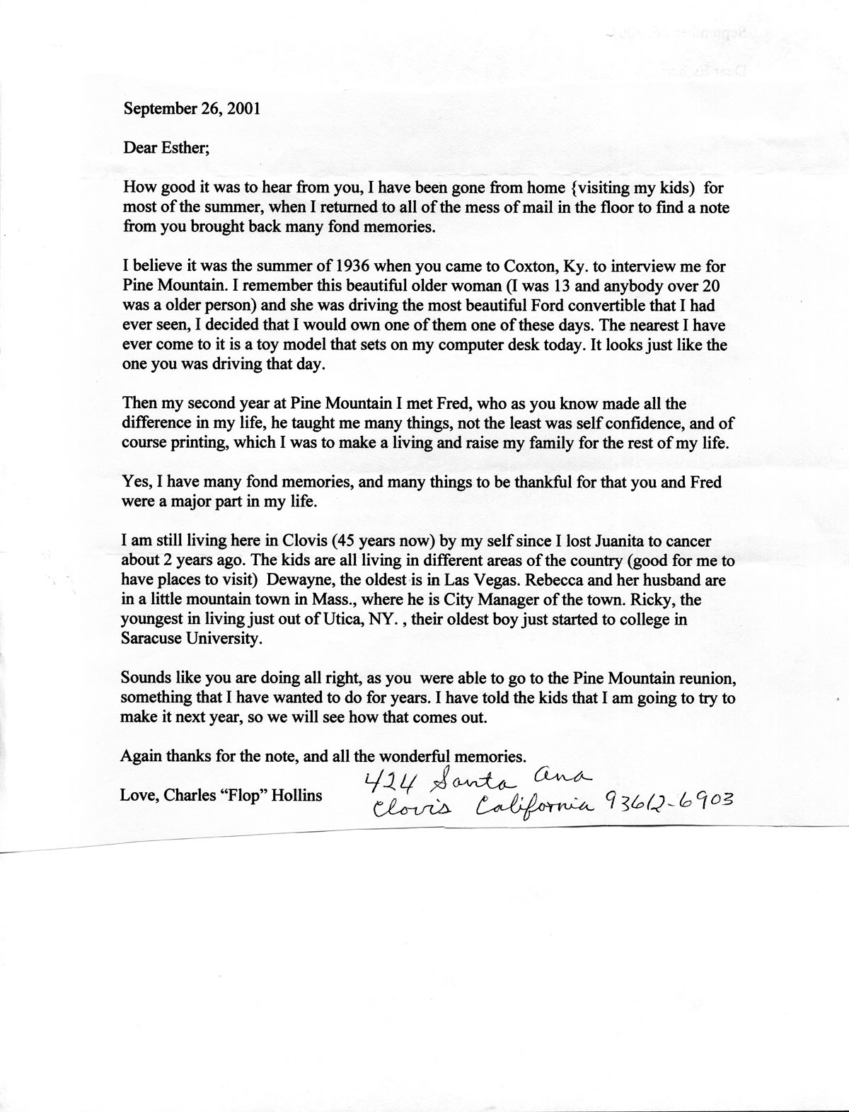 [005] September 26, 2001. Computer-printed letter to Esther [Burkhard] from Charles “Flop” Hollins, Clovis CA. Responding to Esther’s letter which “brought back fond memories.” In approximately summer 1936, Esther had interviewed Charles in Coxton, KY, [concerning attending PMSS]; met Fred [Burkhardt] during his second year at PMSS,