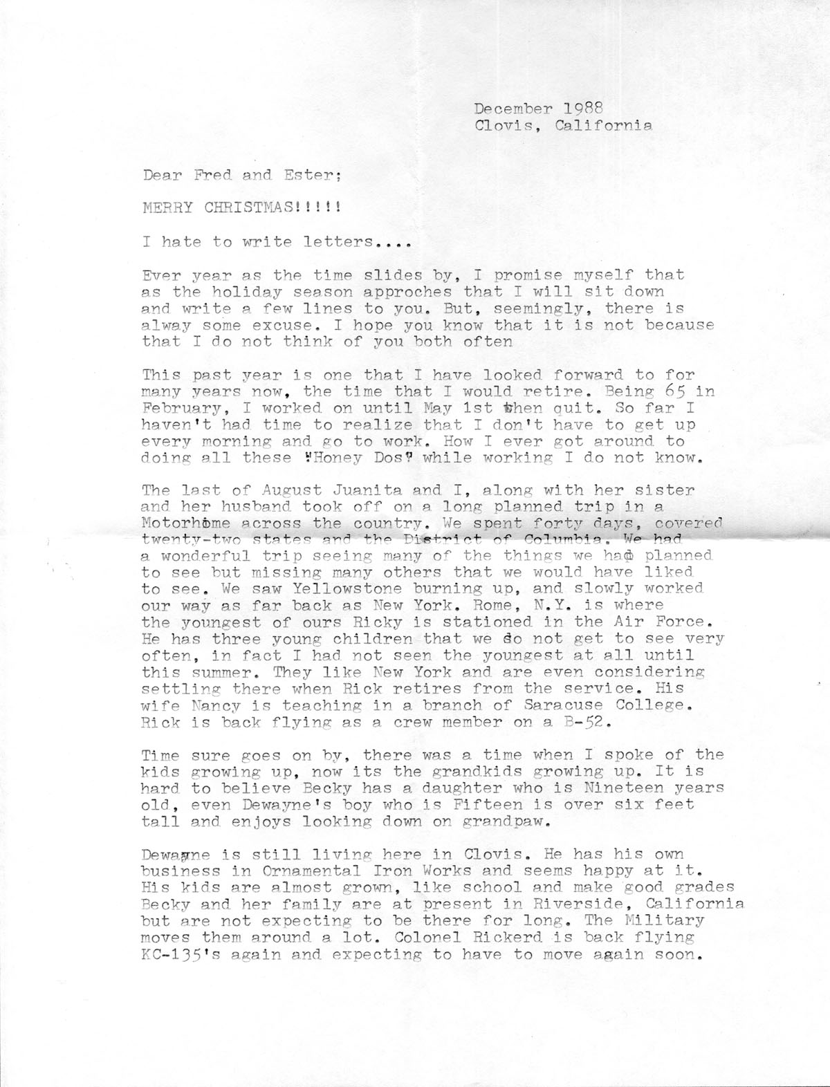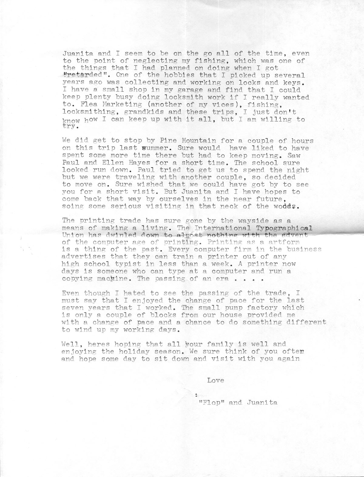003-004 December 1988. Two-page typewritten letter to Fred and Esther [Burkhard] from “Flop” and Juanita Hollins, Clovis, CA. [003] “This past year is one that I have looked forward to for many years now, the time that I would retire.” Describes a 40-day motorhome trip across the country with Juanita; visit with youngest son, Ricky, and his family, in Rome, NY, where he is in the Air Force. Also describes Dewayne and family in Clovis and Becky and family in Riverside, CA. [004] Tells about his hobbies, fishing, flea marketing, travel, and locksmithing. Visited PMSS last summer with Paul and Ellen Hayes. “The school sure looked run down.” Regrets the decline of the printing trade due to the “advent of the computer age of printing…Printing as an art form is a thing of the past.” Mentions a “small pump factory” where he worked the last seven years.