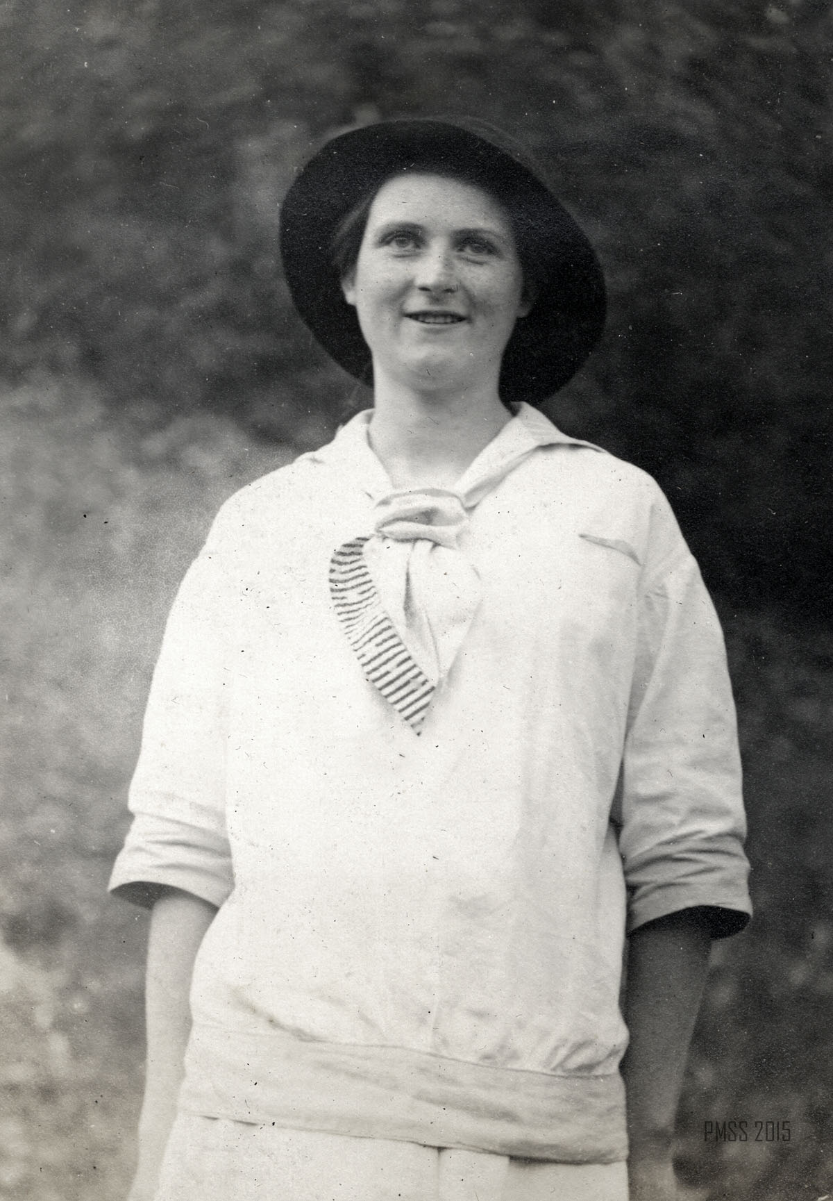 - 024b P. Roettinger Album. “Trancie Turner.” (In white ‘middie’ and dark hat.) [roe.024b.jpg]