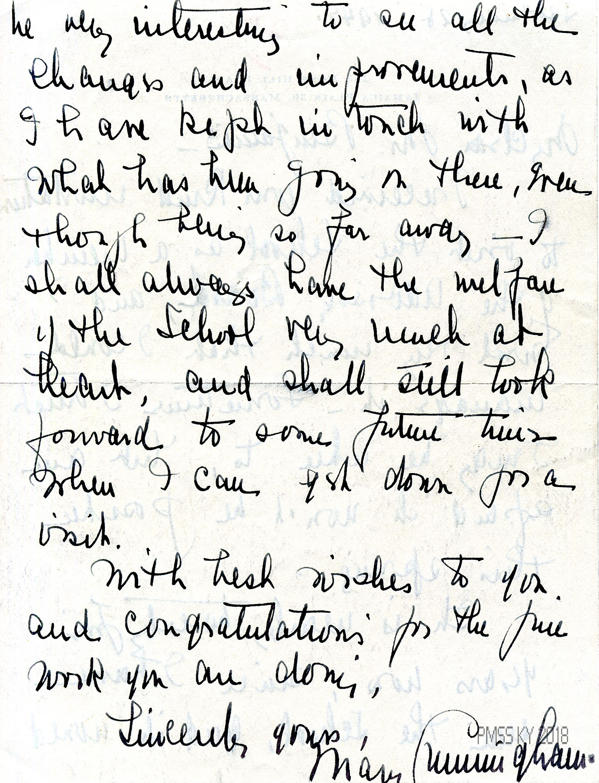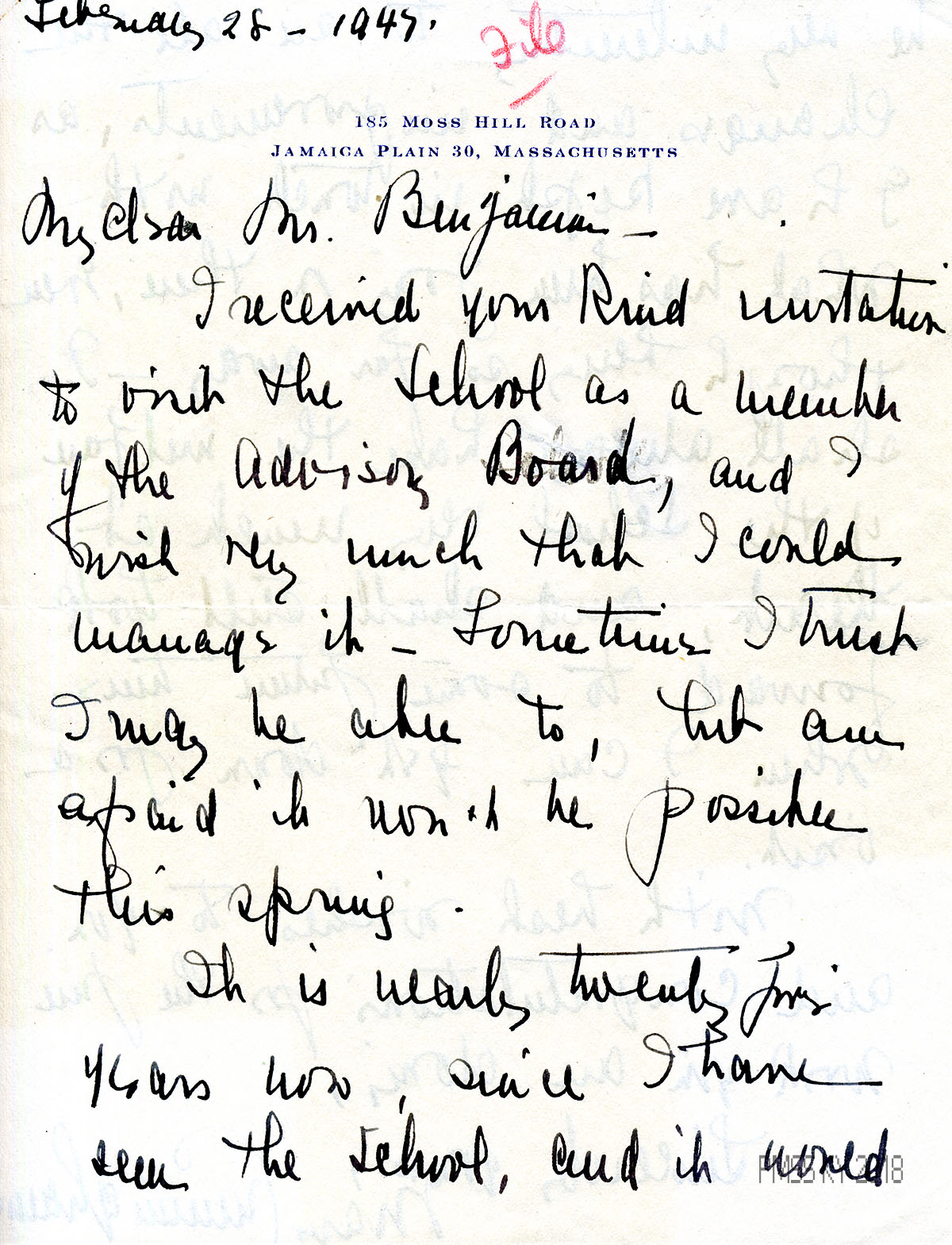 01-02 February 28, 1947, Two-page letter to Mr. (H.R.S.) Benjamin from Mary Rockwell Hook, Jamaica Plain, MA, [01] declining his invitation to visit PMSS as a member of the Advisory Board. “It is nearly twenty-five(?) years now since I have seen the School, and it would [02] be very interesting to see all the changes and improvements, as I have kept in touch with what has been going on there, even though being so far away. I shall always have the welfare of the School very much at heart, and shall still look forward to some future time when I can get down for a visit.”