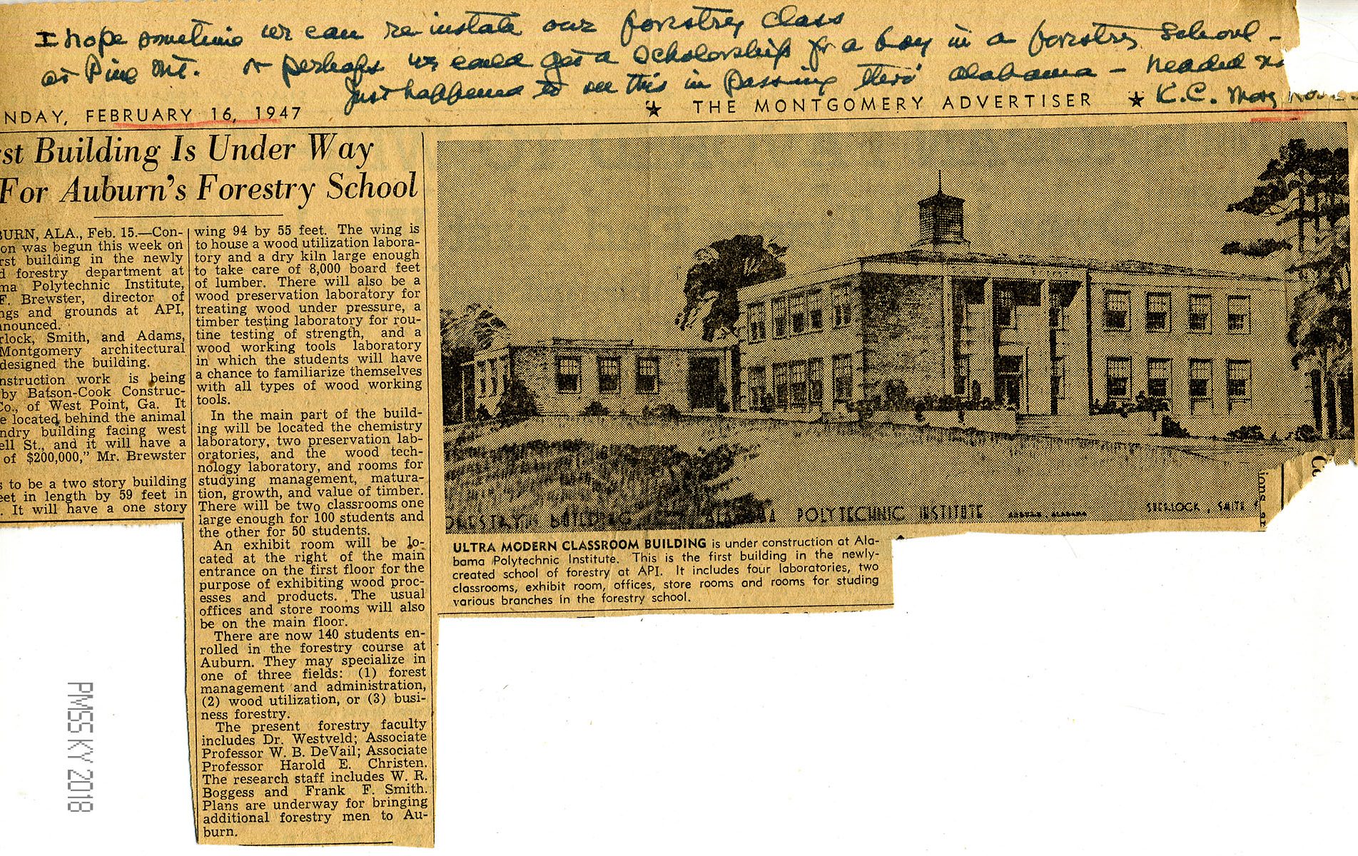 03 (Enclosure) Newspaper clipping from The Montgomery (Alabama) Advertiser dated February 16, 1947. “First Building is Under Way For Auburn’s Forestry School.” Hook’s notation in margin: “I hope sometime we can reinstate our forestry class at Pine Mt. or perhaps we could get a scholarship for a boy in a forestry school….”