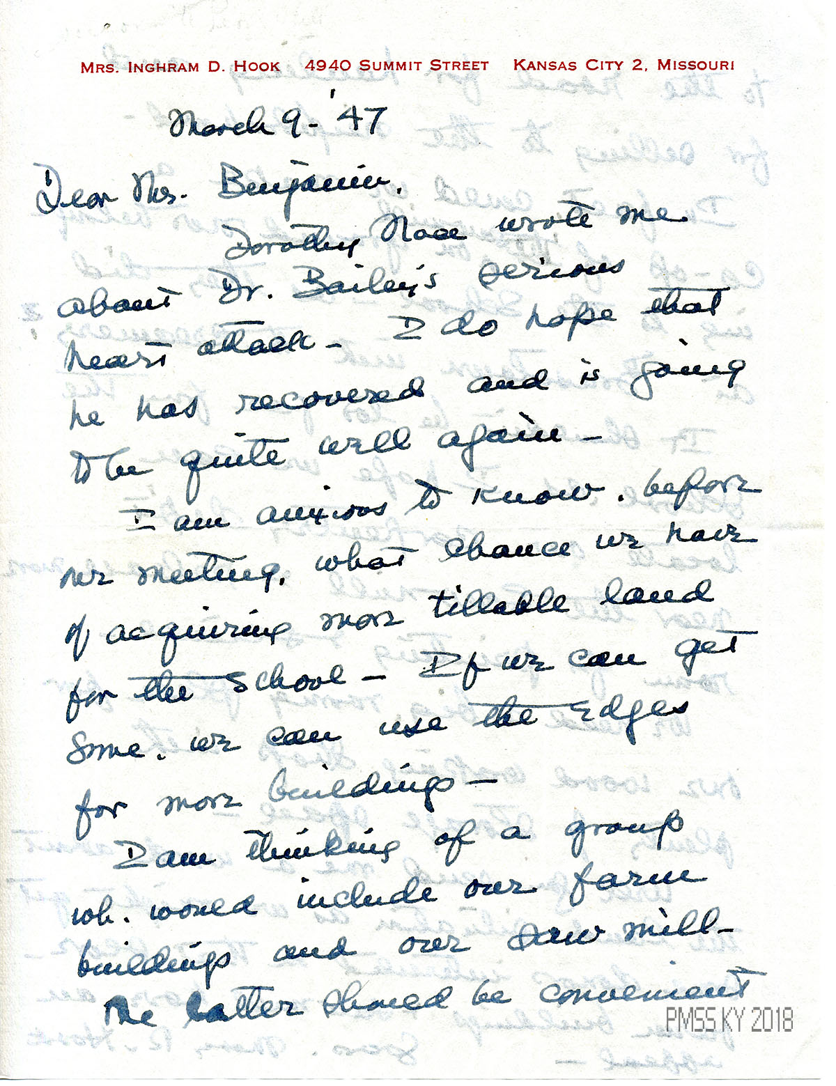 04-05 March 9, 1947. Two-page letter to Mr. Benjamin from Hook, Kansas City, MO, [04] who heard from Dorothy Nace about Dr. (Clark) Bailey’s heart attack. Asks if the School can acquire more tillable land to use for more buildings around the edges, such as farm buildings and sawmill. [05] Perhaps a co-op could run the sawmill; and the carpentry department should be nearby, “releasing more room for printing & science.” Suggests that donors may be interested as “farm buildings & sawmill have an appeal.”