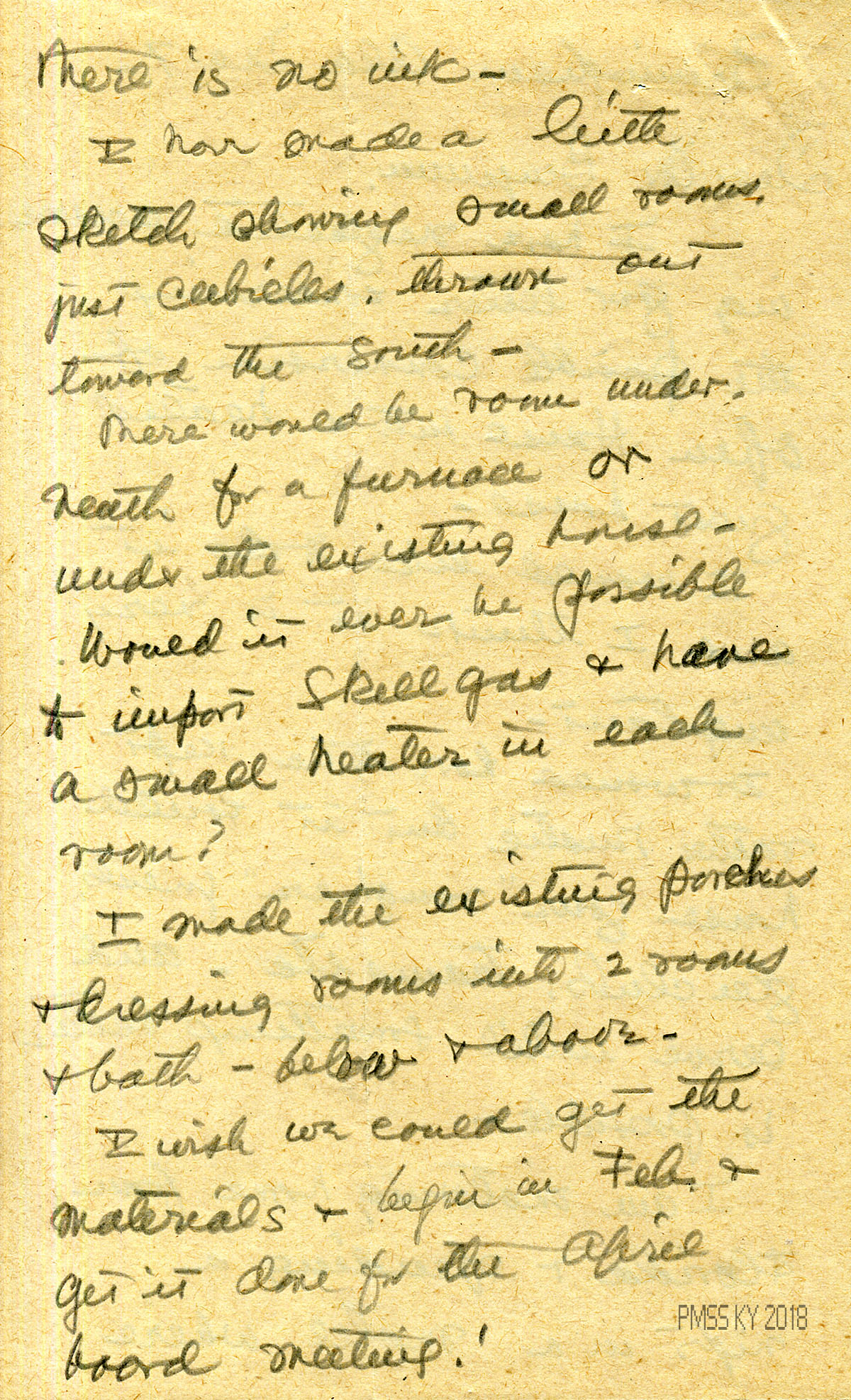 07-08 March 24, 1947. Two-page letter to Mr. (James S.) Crutchfield from Hook, [07] who recommends two aluminum buildings for a sawmill and seed storage by PMSS’s Agricultural Department, made by the Butler Mfg. Co. of Kansas City at $800 each. She describes the buildings, which need a location. “I am much disappointed that a year’s time has brought us no prospect of more farm land.” [08] Hook proposes a co-operative scheme with the neighbors and suggests Charles Creech as president and Bill Hayes as director; set up on land not belonging to the School. “We have not had our neighbors in sympathy with us to date and perhaps the mistake has been ours. They are naturally jealous of our accomplishment & think we think we are superior.” She encloses a blueprint and is asking the Butler Mfg. Co. for figures.