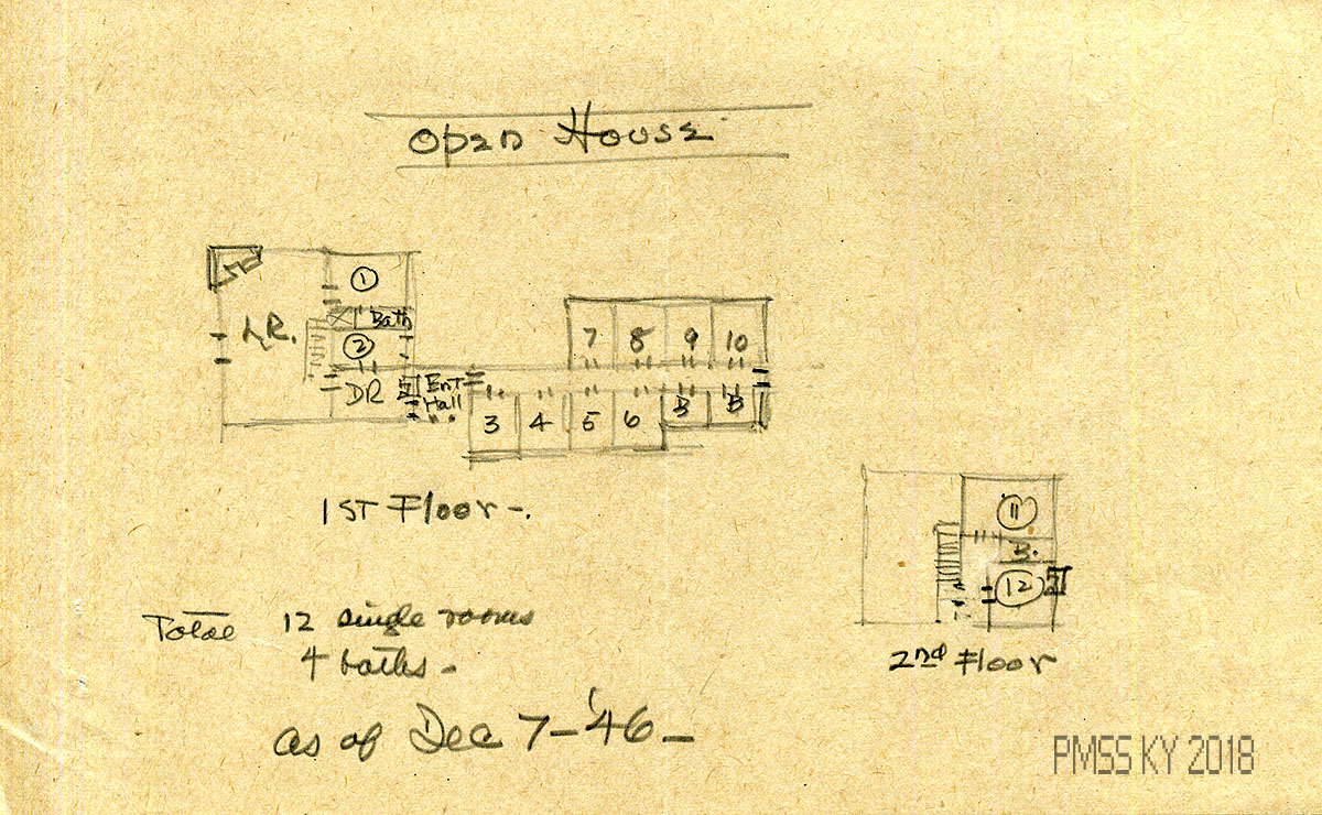 10-14 December 7, (no year). Five-page letter to Benjamin from Hook, [10] answering his letter about converting Open House into a heated guest house with which she agrees. “It would have to be kept rather rustic but it could house your ‘rougher’ guests, glee clubs, teams, etc….” [11-12] She provides a sketch (12 single rooms and 4 baths) and explains how it could be done. [13] “I will gladly give Open House to the School, The land will revert to the School at my death. I believe that Mrs. (Fanny) Gratz & Mrs. Bullock will relinquish their claims, if you ask them.” Hook offers to make a plan to enlarge Open House and start a fund by contributing $1,000 when the conversion begins. [14] Hook thinks that Mrs. Gratz and Mrs. Bullock “have no legal claim to the house & not at all to the land.”