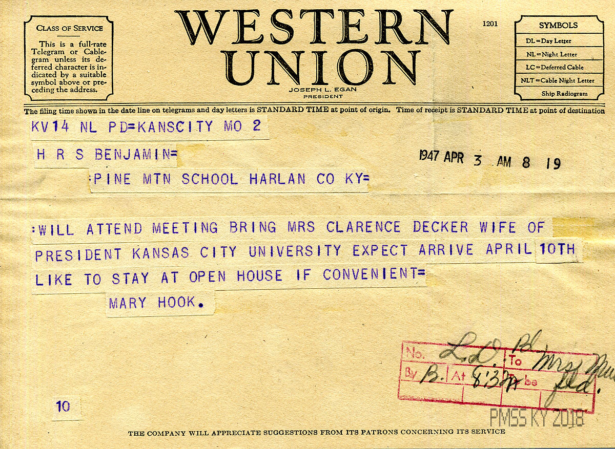 15 April 3, 1947. Western Union telegram to Benjamin from Hook, informing him that she will attend the Board meeting; will bring Mrs. Clarence Decker, wife of the President of Kansas City University. She hopes to stay at Open House.