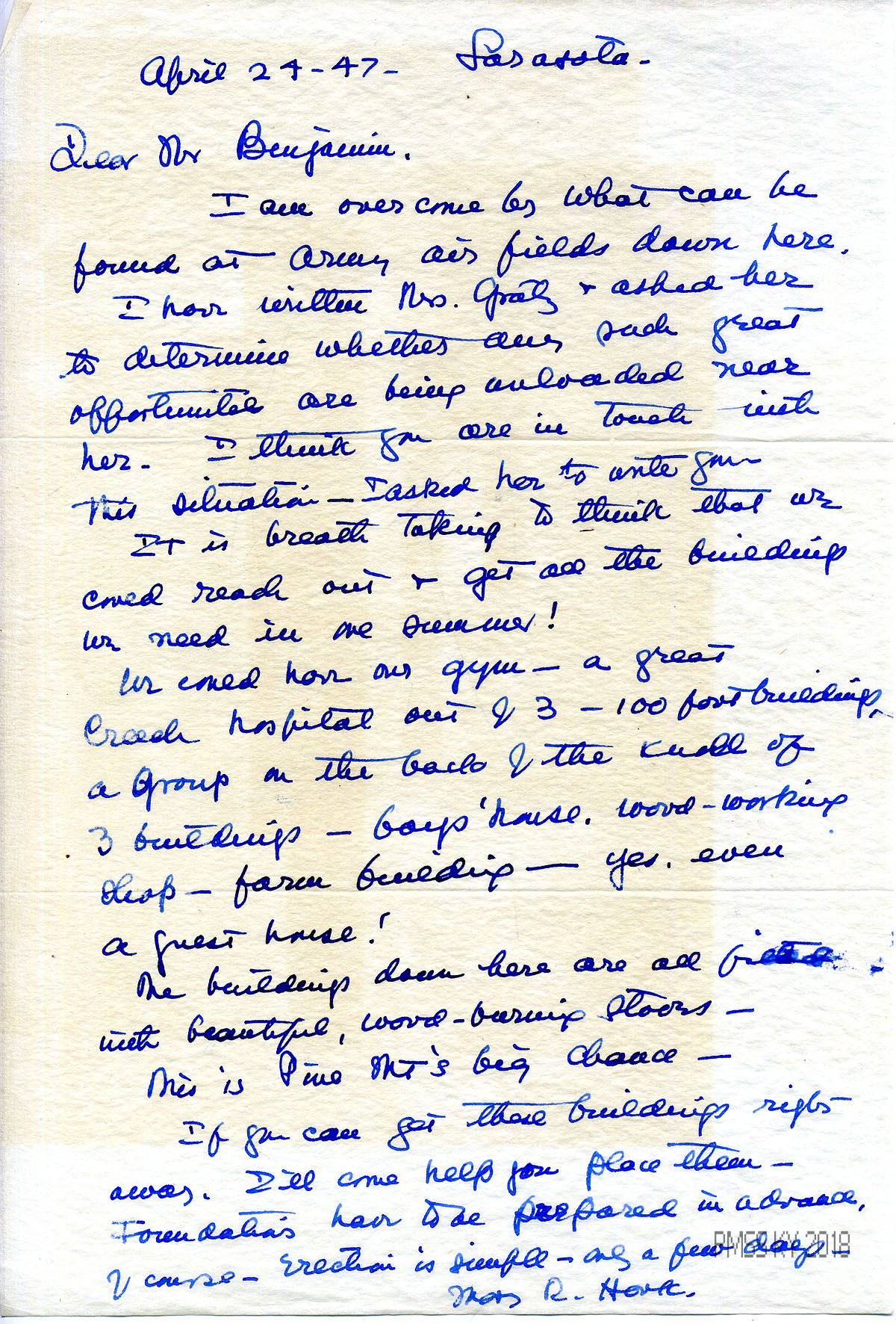 17 April 24, 1947. To Benjamin from Hook in Sarasota, FL, informing him of the buildings that can be obtained at the Army air fields. Hook imagines the various uses of these buildings on the PMSS campus: gym, Creech hospital, boys’ house. She offers to help place them.
