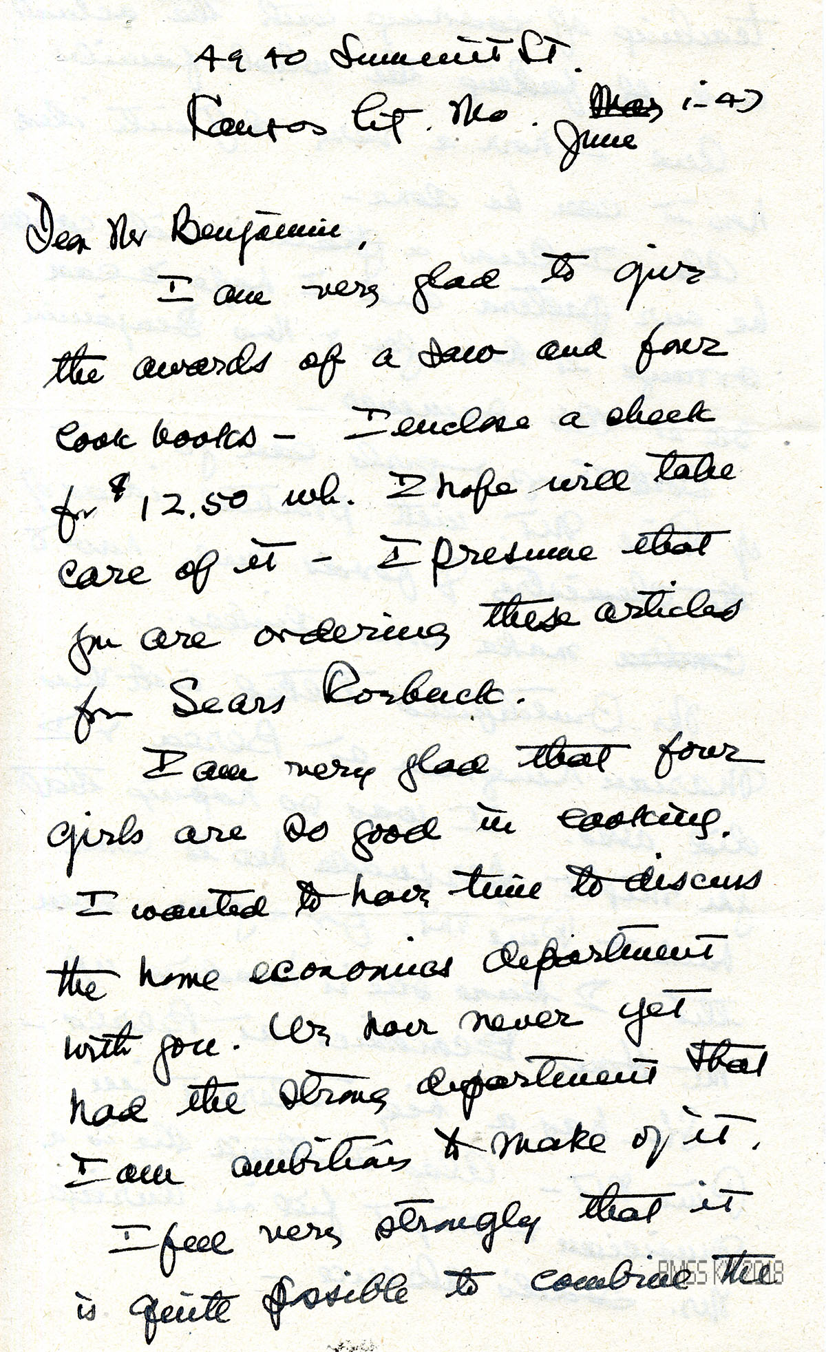 19-22 June 1, 1947. Four-page letter to Benjamin from Hook in Kansas City, MO, [19] who encloses a $12.50 check for the saw and cookbook awards. She hopes to discuss the home economics department with Benjamin. “We have never yet had the strong department that I am ambitious to make of it.” [20] Suggests combining “teaching of cooking with the actual work of feeding the whole family.” Hook hopes to show Mr. and Mrs. Benjamin a place that could be a pattern for PMSS. Mr. Crutchfield and Hook are trying to persuade Marian Kingman, who is head of the Berea College home economics department, to return to PMSS for a year. She is also a musician who could fill in for (Arthur) Dodd in his absence. [21] Hook offers to create an outline of how to manage home economics at PMSS. Asks where the sawmill has been located and whether an ex-Army building can be used for wood storage. [22] Hook is currently erecting seven of the huts in Kansas City and four in Florida, combining them into houses. She will be planning an addition to Open House.