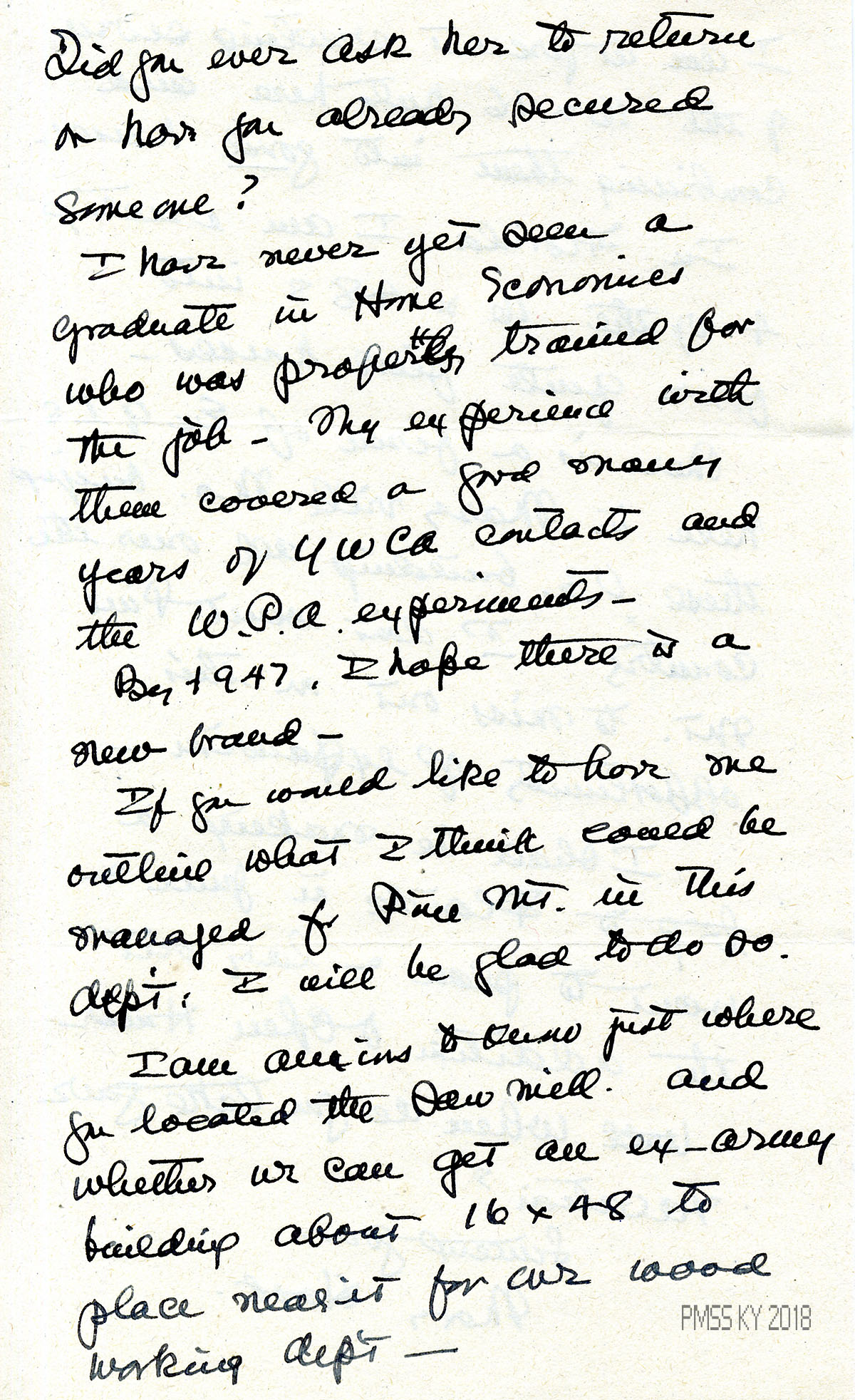 23-24 June 5, 1947. Two-page letter to Hook from (unsigned, apparently Benjamin), who responds to her June 1 letter, showing interest in all that she suggests. [23] He agrees that home economics and kitchen of Laurel House need improvement. Now that Miss (Helen) Kingsbury of the home economics department is leaving, he can make personnel changes. Miss Kingman has been approached several times to return to PMSS to no avail. “The sawmill is located in the old spot, up the Hollow, but a bit higher.” Asks if the ex-Army buildings might be expensive. [24] Describes the building that the Woodwork Shop needs, which could be less expensive if built locally. Asks her to visit PMSS to discuss a hospital enlargement using the huts and to meet Mr. (Frank W.) Cheney, the new Shop supervisor; also to study Open House needs.
