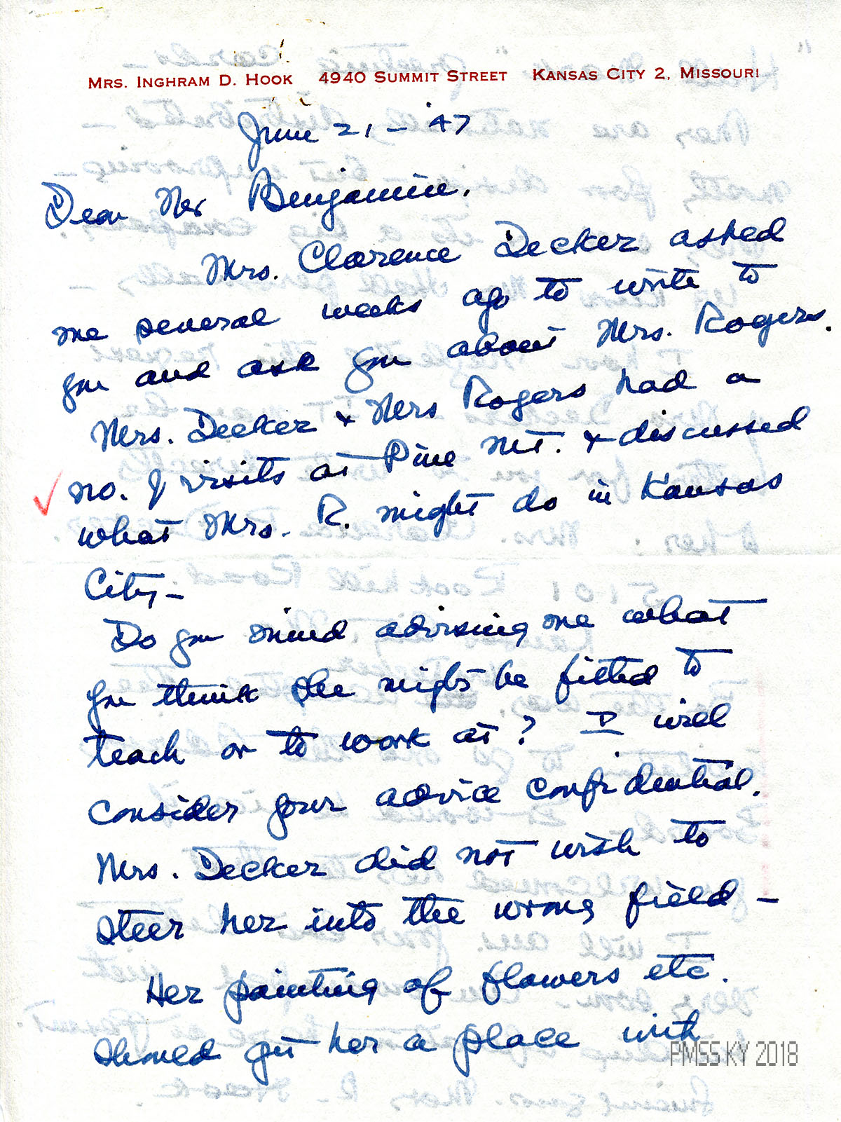 25-26 June 21, 1947. Two-page letter to Benjamin from Hook, [25] asking his advice concerning Mrs. (Mary Cook) Rogers’ abilities so that Mrs. Clarence Decker can find the right place for her in Kansas City. [26] Suggests Mrs. Rogers’ artistic talent could be applied to “Hall-Mark” greeting cards. Hook knows Mr. Hall personally. Mrs. Decker accepted an invitation to join the Advisory Board.