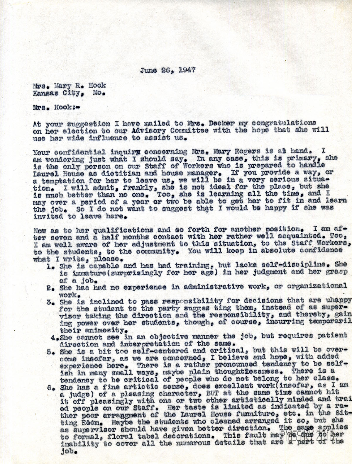 27-28 June 26, 1947. To Hook from Benjamin, [027] who responds to Hook’s “confidential inquiry concerning Mrs. Mary Rogers. …[S]he is the only person on our Staff of Workers who is prepared to handle Laurel House as dietitian and house manager. If you provide a way…for her to leave us, we will be in a very serious situation.” He then gives his thoughts on her qualifications. [028] He is willing to change to another employee if Hook or someone else finds someone else who can handle the job.
