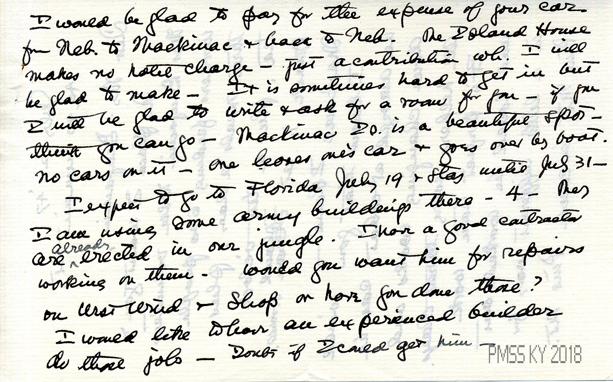 34 July 15, 1947. To Hook from (unsigned, apparently Benjamin), who declines a trip to Mackinac Island because he can’t leave PMSS. July 21, 1947. (He resumes his letter after a delay.) Roof repairs on West Wind and Boys’ Industrial were held up due to daily heavy rains, which is also affecting farming.