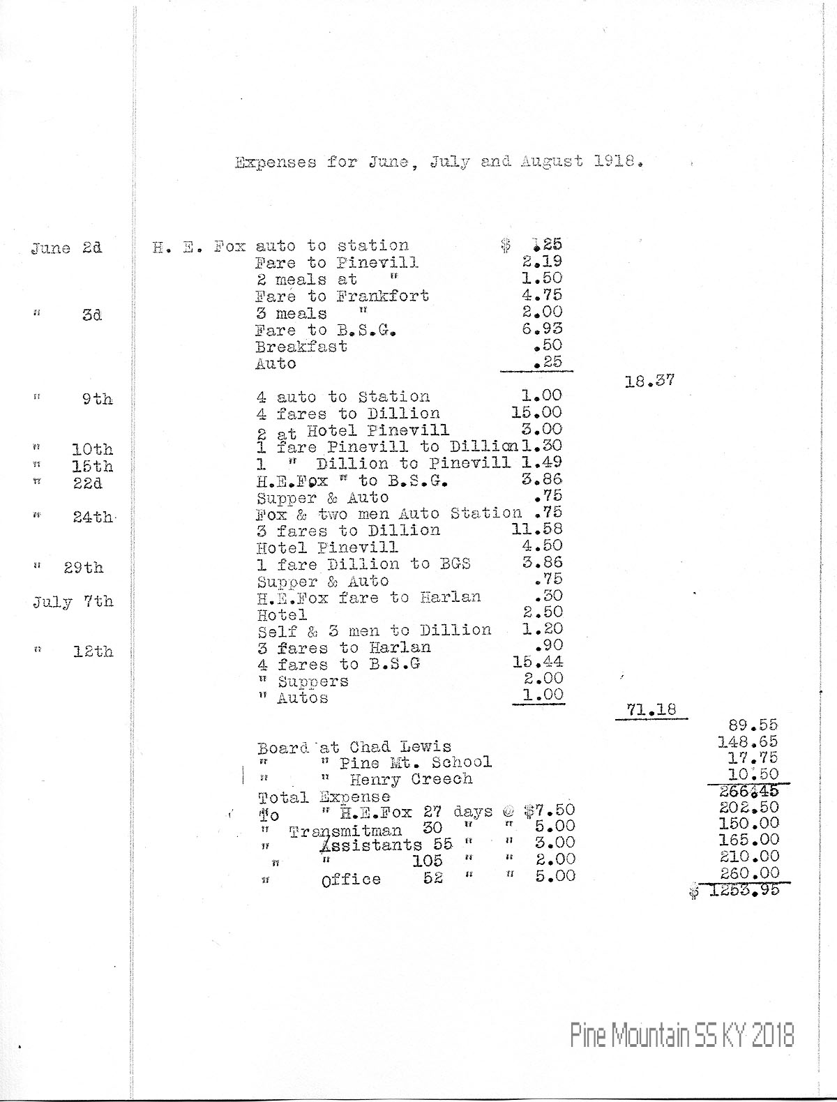 Board at Chad Lewis Board at Pine Mt. School Board at Henry Creech Total Expense “ “ H.E. Fox 27 days @ $7.50 “ “ Transmitman 30 days @ 5.00 “ “ Assistants 55 days @ 3.00 “ “ Assistants 105 days @ 2.00 “ “ Office 52 days @ 5.00 |