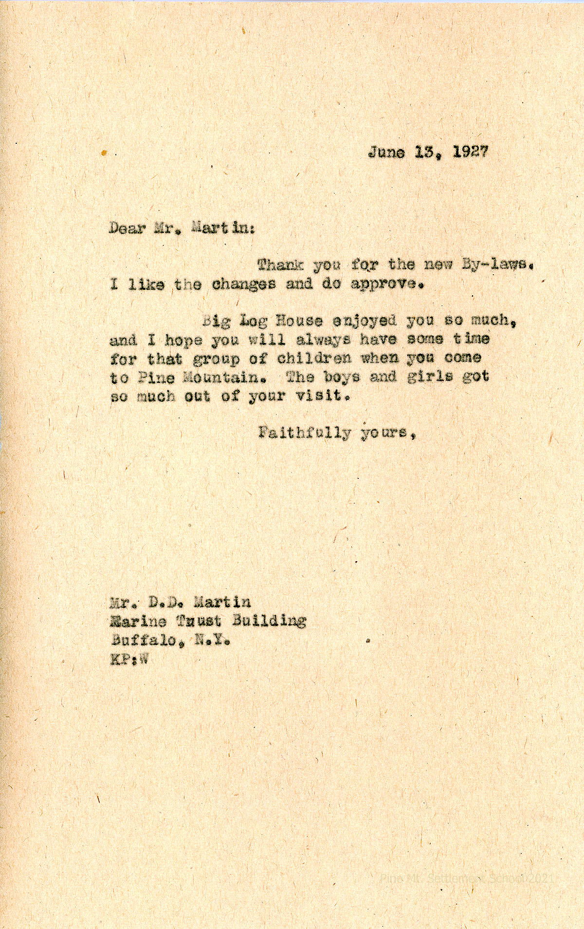 026 June 13. KP (Katherine Pettit) to Martin, approving the By-Laws. “Big Log House enjoyed you so much, and I hope you will always have some time for that group of children when you come to Pine Mountain. The boys and girls got so much out of your visit.”