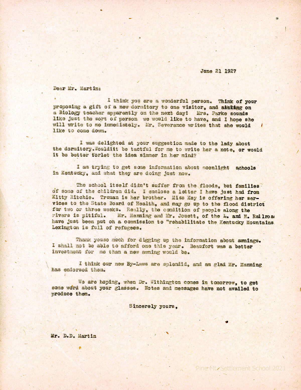 027 June 21. (Unsigned, possibly Zande) to Martin, expressing appreciation for his assistance in fundraising for a new dormitory and recruiting new staff. Mentions moonlight schools in Kentucky and the effects of flooding on the community as described in the enclosed letter from Kitty Ritchie. Miss Key is volunteering her services to the State Board of Health, and Mr. Manning and Mr. Jouett of L. and N. Railroad joined a commission to “Rehabilitate the Kentucky Mountains.” Mentions the awnings, Mr. Manning’s endorsement of the By-Laws, and Dr. [Alfreda] Withington.
