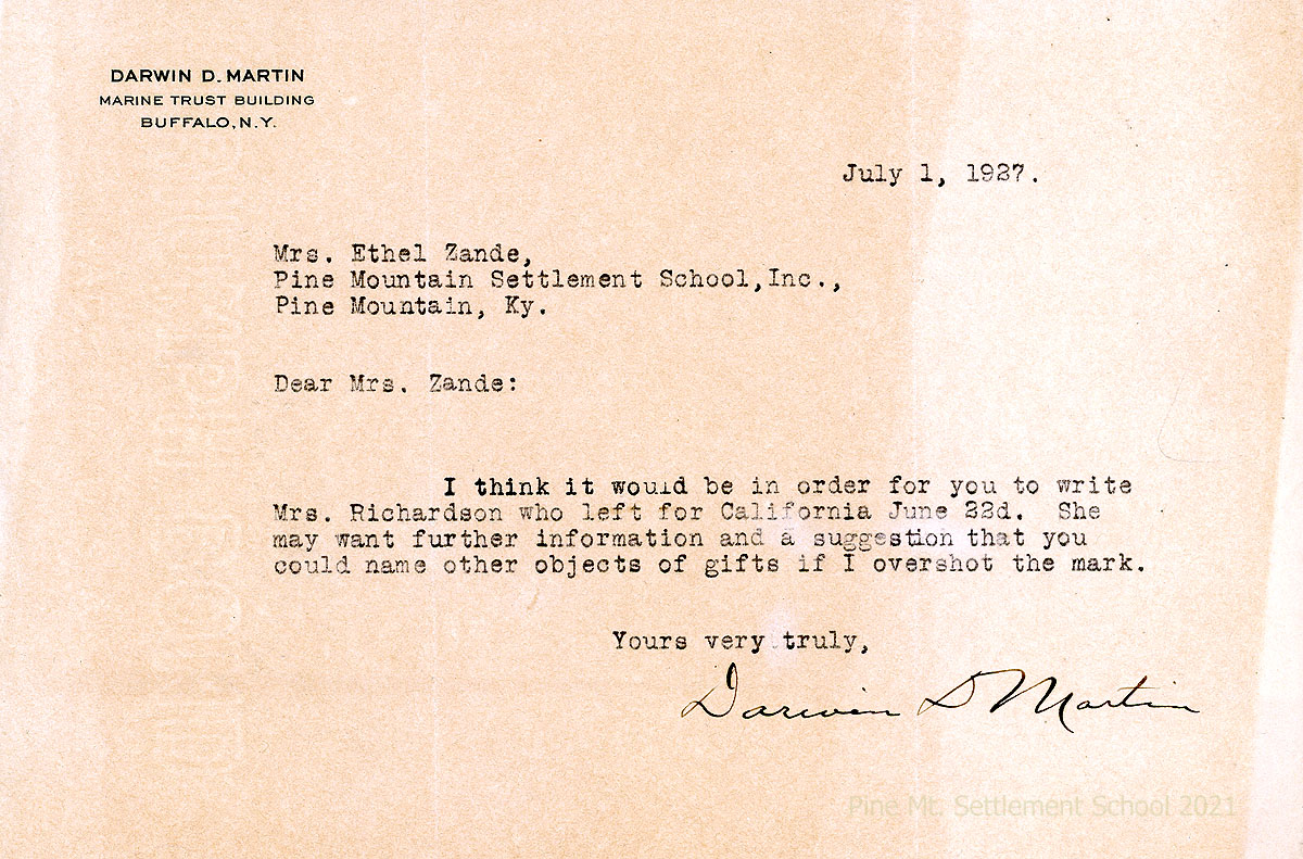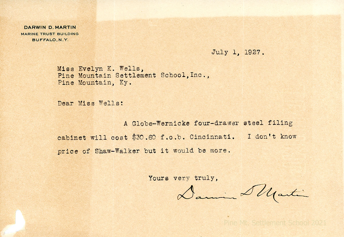 TAGS: Darwin D. Martin, 1927 correspondence 1, Pine Mountain Settlement School Trustees, Ethel de Long Zande, advice, counsel, Delco Power generator, Ford truck, Katherine Pettit, Evelyn K. Wells, student labor, donations, gifts, by-laws, liabilities, Frank Lloyd Wright, mailing lists, printshop, postal service, C.N. Manning, fundraising, flooding, L. & N. train service, Columbus Creech, filing cabinets, auditors, laundry machinery