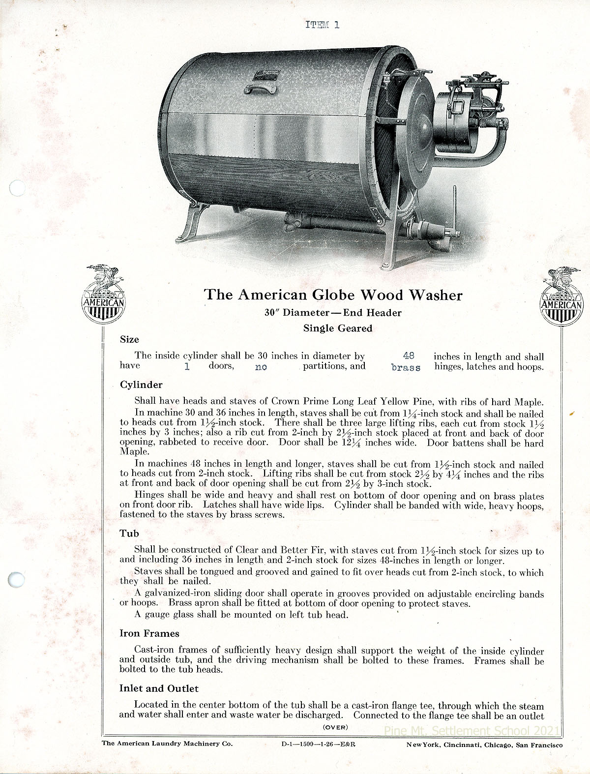 048-049 N.D. Two-page specification sheet for “The American Globe Wood Washer,” 30” diameter by 48 “ long — end header, single geared.