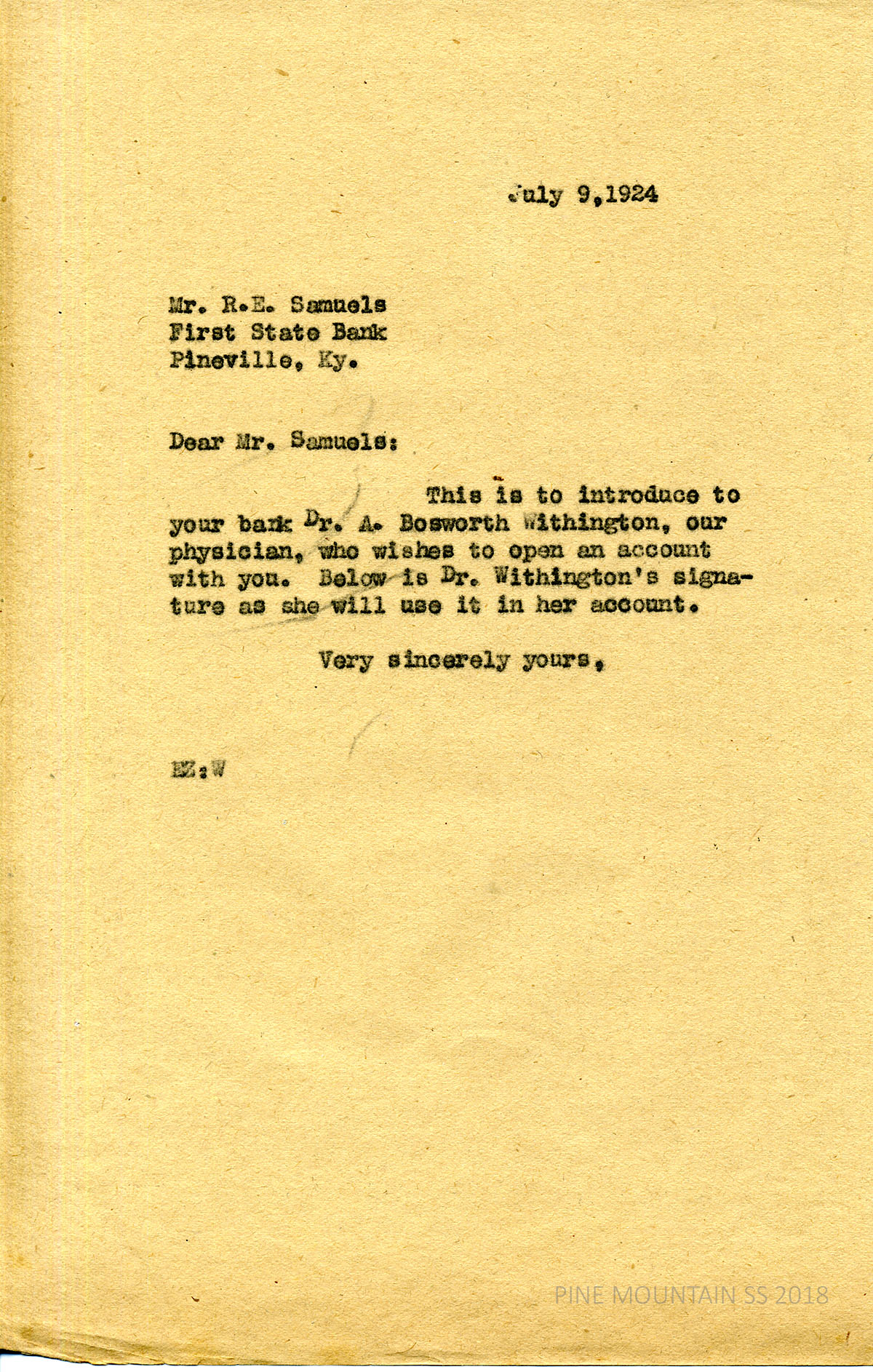 [withington_a_051.jpg] July 9, 1924. Carbon copy of unsigned typewritten note to Mr. R.E. Samuels, First State Bank at Pineville, Ky., from EZ (Zande). Introduces Withington and encloses a sample of Withington’s signature