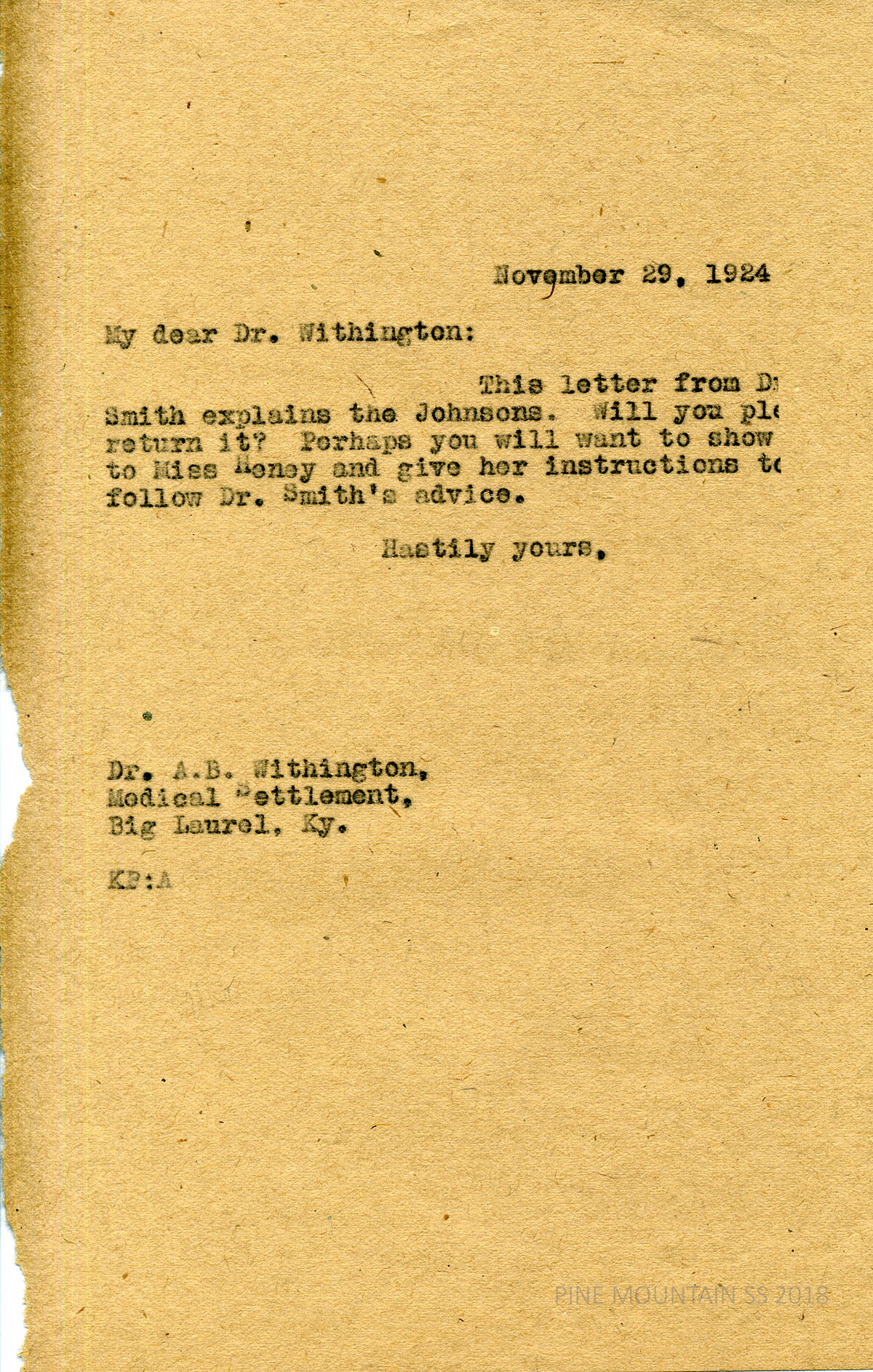 [withington_a_052.jpg] November 29, 1924. Carbon copy of unsigned typewritten note to Withington at Medical Settlement, Big Laurel, Ky., from KP (Katherine Pettit). Encloses letter from Dr. Smith explaining the Johnsons. “Perhaps you will want to show to Miss Heney and give her instructions to follow Dr. Smith’s advice.”