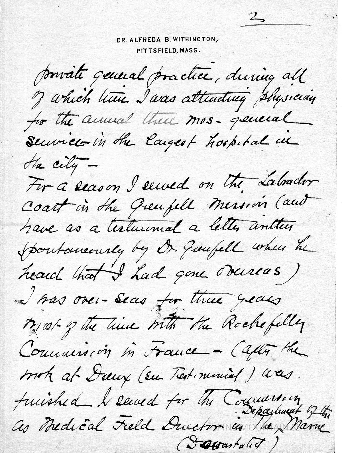 [withington_a_002.jpg] January 20, 1924. Handwritten 3-page note to [no salutation] from Miss S.C. Rogers of Pittsfield, MA. Saw notice in Journal A.M.A. and recommends “a person who might like that kind of work.” [002a] Page 2: Describes her credentials. [002b] Page 3: Requests more information about the work.