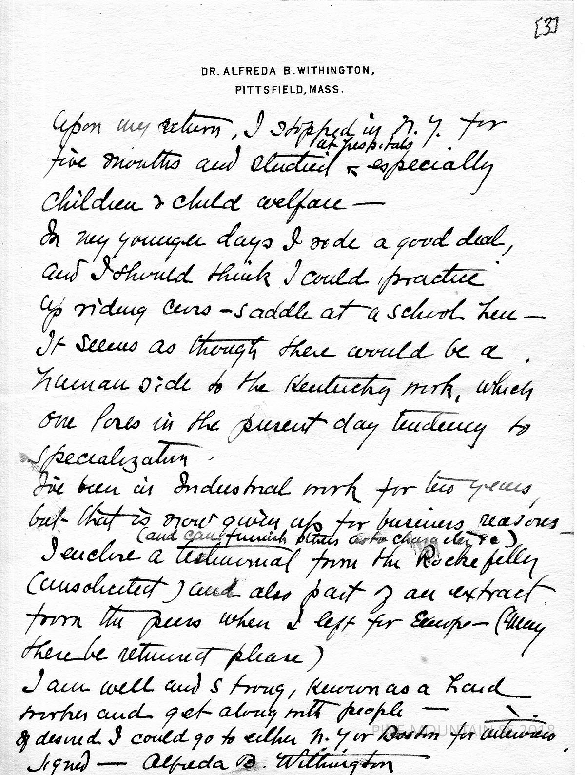 [withington_a_003.jpg] January 22, 1924. Handwritten 3-page letter to [no salutation] from Dr. Alfreda B. Withington. Pittsfield, MA. Indicates her interest in the work and her training and experience. Lists her qualifications; asked for more information about the position. [003a] – [003b] Pages 2-3 Continues listing qualifications. “It seems as though there would be a human side to the Kentucky work, which one (?) in the present day tendency to specialization.” Encloses a testimonial from the Rockefeller [Commission] and part of an extract from the press. Prefers N.Y. or Boston for interview.