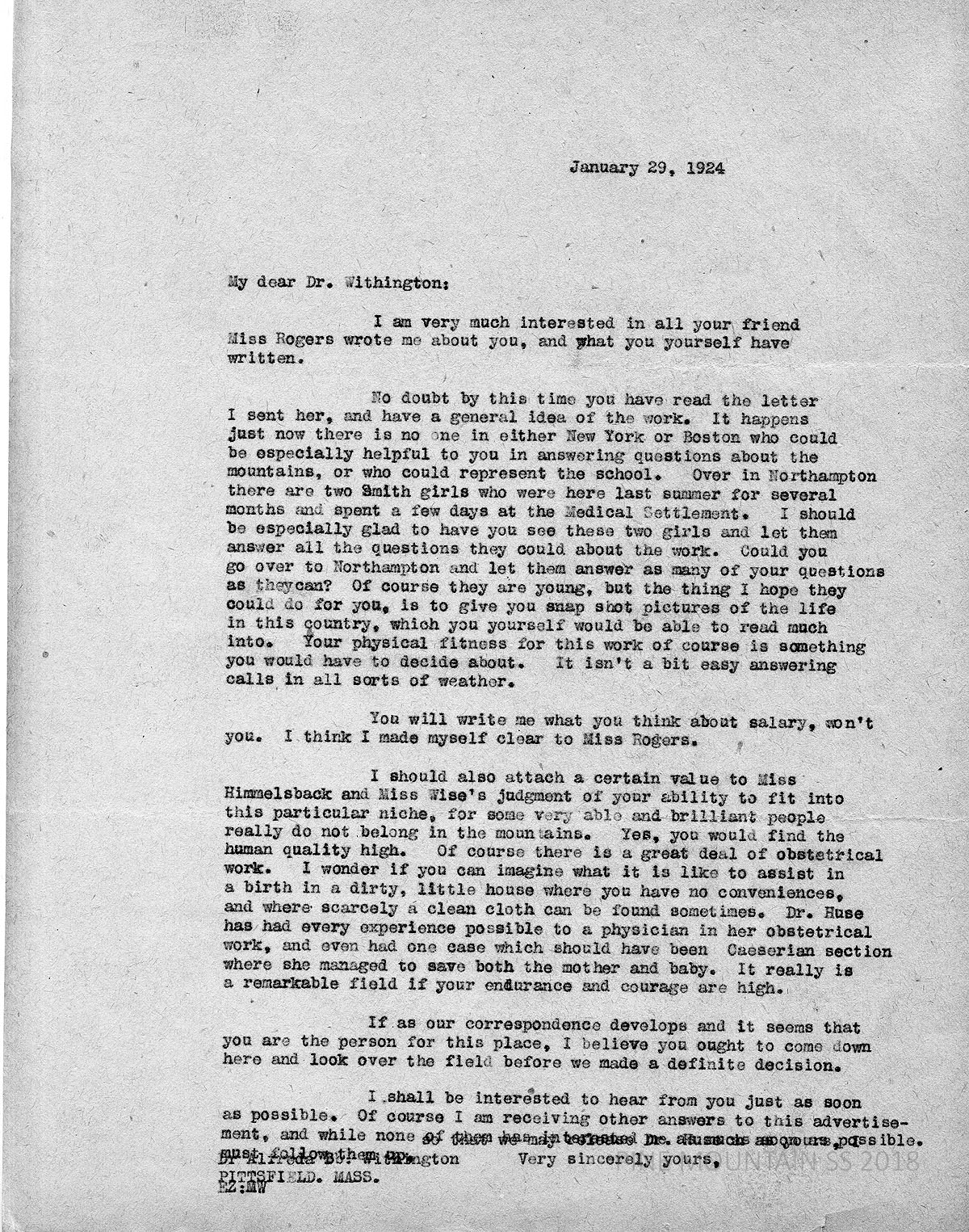 [withington_a_008.jpg] January 29, 1924. Carbon copy of unsigned typewritten letter to Withington from EZ (Ethel Zande). Expresses interest in what Rogers and Withington have written; refers to her letter to Rogers with information about the position; suggests that Withington meet in Northampton with “two Smith girls who were [at PMSS] last summer for several months and spent a few days at the Medical Settlement who would answer her questions about the work; asks her to write her thoughts about salary; describes the conditions under which she would work. “Dr. Grace Huse has had every experience possible to a physician in her obstetrical work…. Cesarean section where she managed to save both the mother and baby. It really is a remarkable field if your endurance and courage are high.” Invites her to visit.