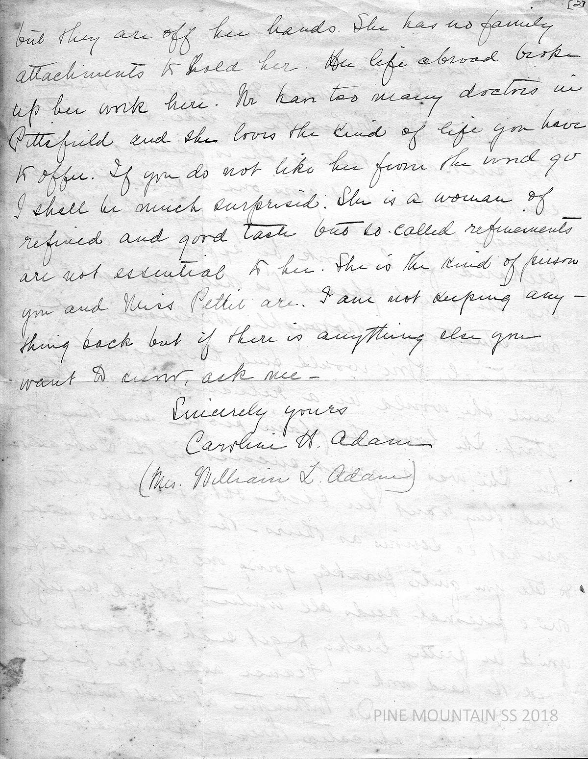 [withington_a_009.jpg] February 2, 1924. Handwritten 2-page letter to Zande from Caroline H. Adam (Mrs. William L. Adam) in Pittsfield, MA. Describes Dr. Withington as “attractive personally, that is she is pleasant and companionable and gives one a sense of reserve strength equal to any emergency.” Describes Withington’s experience, good judgment, reliability. “She loves the plain people and they love her.” Relates examples of her work in Labrador and France. “I’ve known Dr. Withington at least twenty-four years. She has educated three nephews and a niece….” [009a] Page 2. “She is a woman of refined and good taste but so-called refinements are not essential to her. She is the kind of person you and Miss Pettit are.”