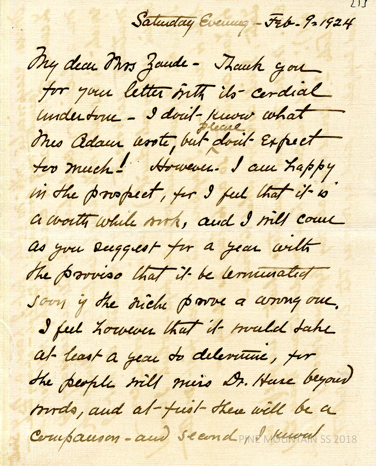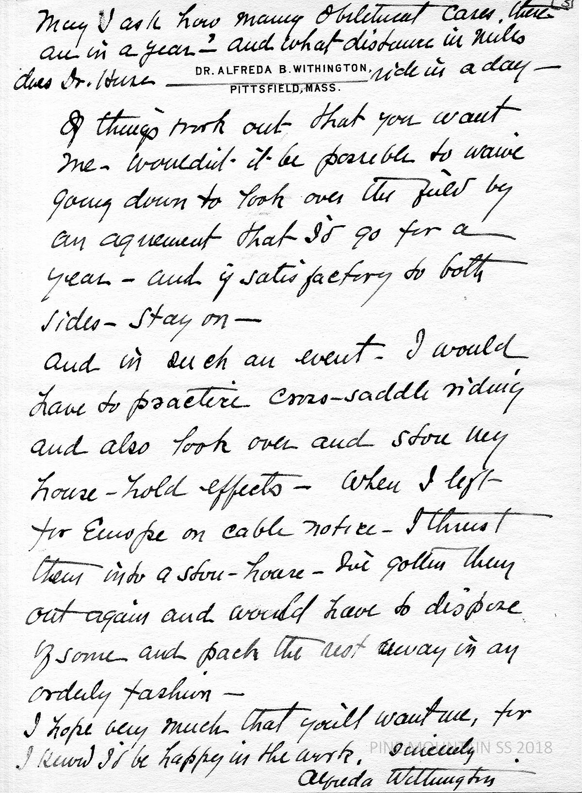 [withington_a_010.jpg] February 2, 1924. Handwritten 3-page letter to Zande from Withington. “As far as seeing the Smith College girls is concerned – I do not need to on my own account, for I am very sure I’d like the mountains. And many a child I’ve ushered into life under circumstances as needy as could be found anywhere.” Assures Zande of her “fitness.” [010a] Page 2. Describes “awful winters” in Mass. “I’m not a biblical person – far from it – but culturally (?) practical, and the poor and ‘down and out’ have usually liked me.” Describes her studies in obstetrics. [010b] Page 3. Asks about the number of Dr. Huse’s obstetrical cases and miles she rides in a day. She states that she doesn’t need to visit PMSS first and asks for “an agreement that I’d go for a year – and if satisfactory on both sides – stay on.” If accepted, she would have to practice “cross-saddle riding” and store her household effects.