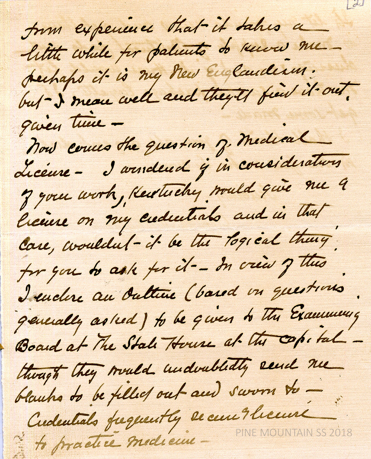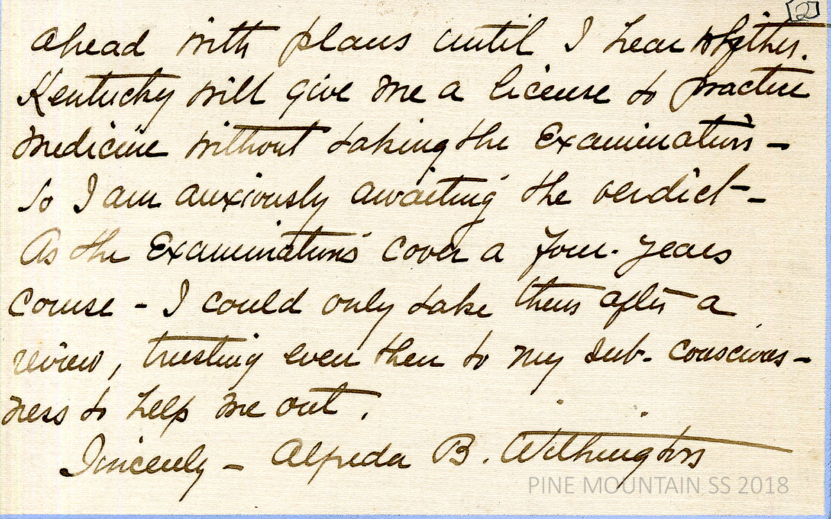 [withington_a_013.jpg] February 9, 1924. Handwritten 4-page letter to Zande from Withington: Agrees to one year or sooner “if the niche prove a wrong one.” She feels that it would take a year for the people to adjust to a new doctor. [013a] Page 2. Asked Zande if she would request a Kentucky license from the state Examining Board based “on credentials.” [013b] Page 3 and [013c] Page 4. More on NY, KY and Mass. credentials and the desire to avoid red tape and expense. Next will be questions concerning what to bring, with an offer of donations of medical supplies and layettes from her and her friends.