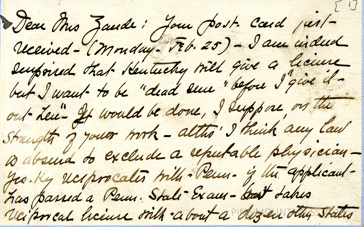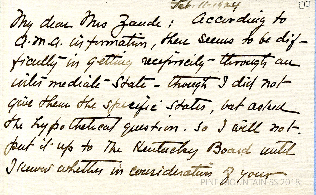 [withington_a_014.jpg] February 11, 1924. Handwritten 2-page letter to Zande from Withington: Informed Zande that, according to the AMA, “there seems to be difficulty in getting reciprocity through an intermediate state…” but will still see if the Kentucky Board would give a license on credentials based on Zande’s work at PMSS. “It would be tragic if they wouldn’t!” [014a] Page 2.