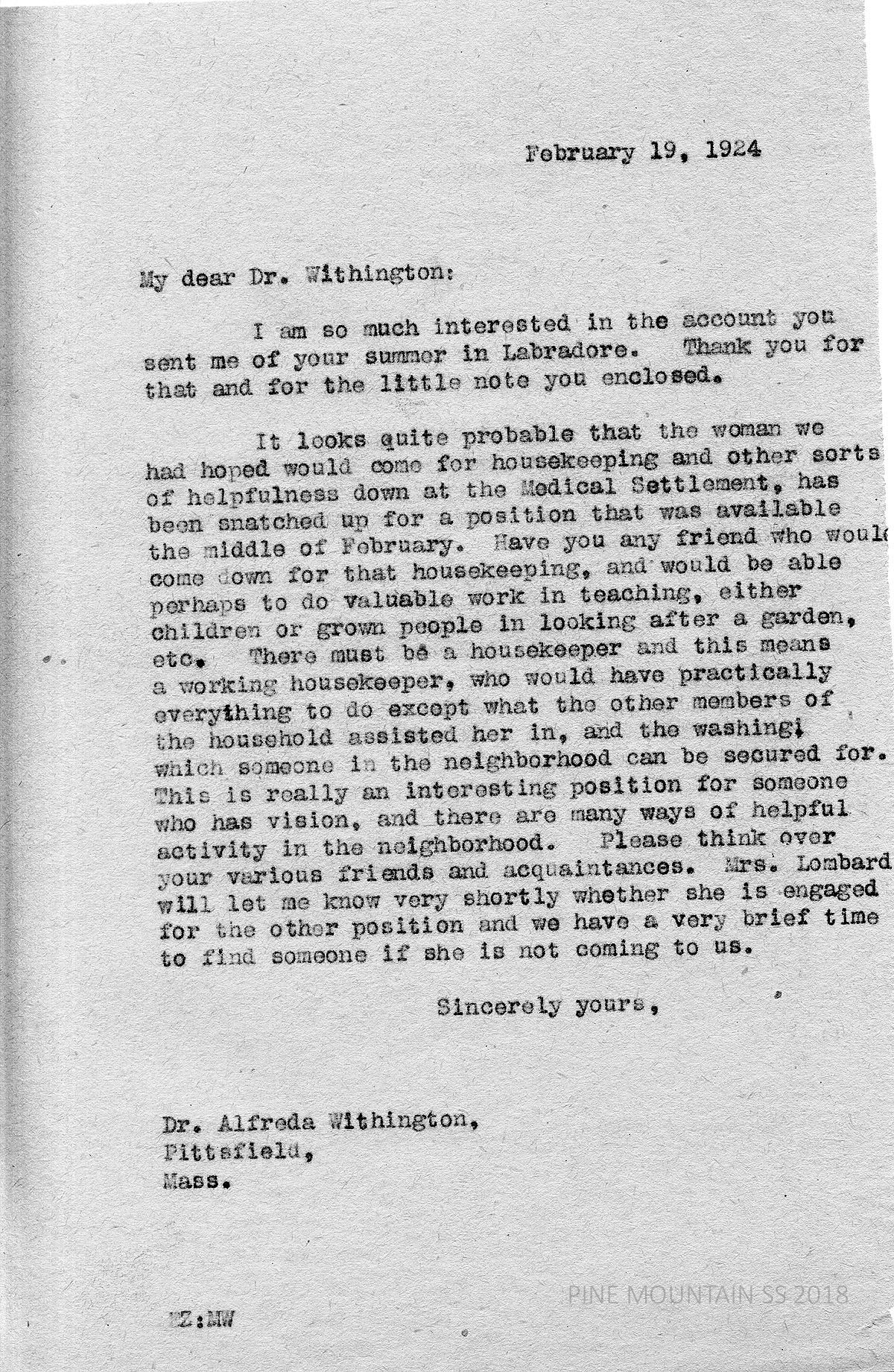 [withington_a_017.jpg] February 19, 1924. Carbon copy of unsigned typewritten letter to Withington from EZ (Ethel Zande). Thanks her for sending her account of her Labrador summer; asks if Withington could bring with her a Medical Settlement housekeeper, since the current one – Mrs. Lombard – accepted another job. Describes the work of the housekeeper.
