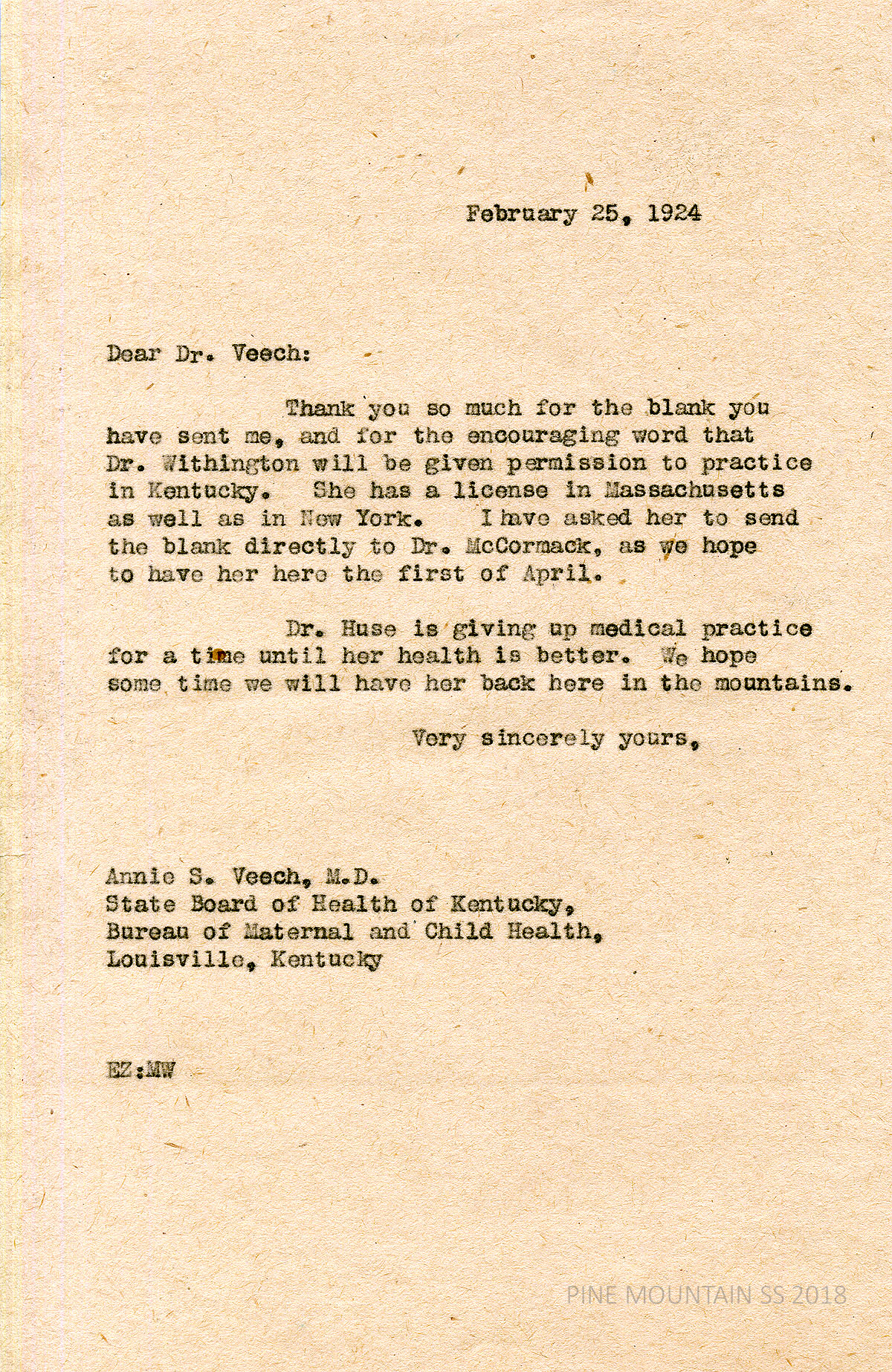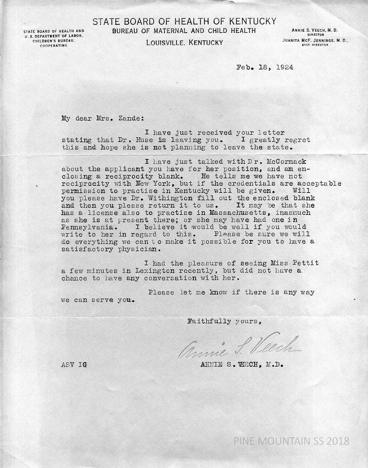 [withington_a_018.jpg] February 18, 1924. Typewritten letter to Zande from Annie S. Veech, M.D., Director, State Board of Health of Kentucky, Bureau of Maternal and Child Health, Louisville, KY. Encloses a “reciprocity blank” for Withington to complete. “…[W]e have not reciprocity with New York, but if the credentials are acceptable permission to practise (sic) in Kentucky will be given.”