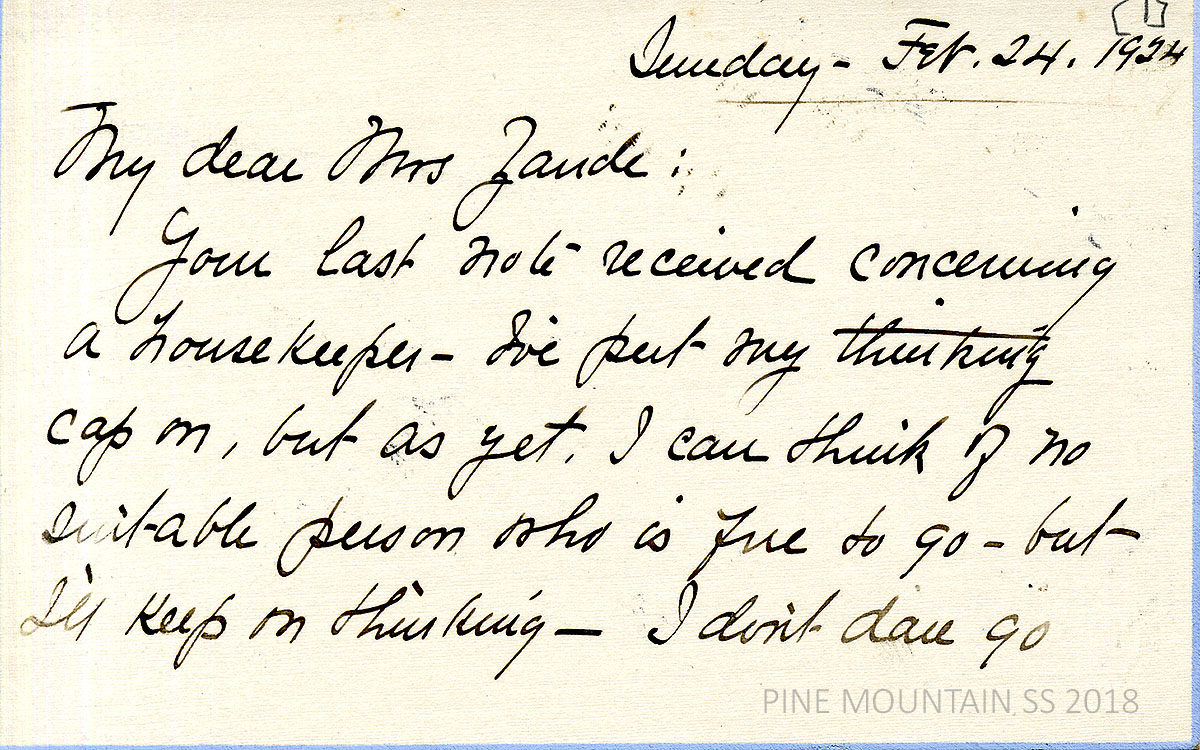 [withington_a_019.jpg] February 24, 1924. Handwritten 2-page letter to Zande from Withington. She “can think of no suitable person” to serve as housekeeper yet. [020] Page 2. Awaiting the decision of the Kentucky Board concerning her license.