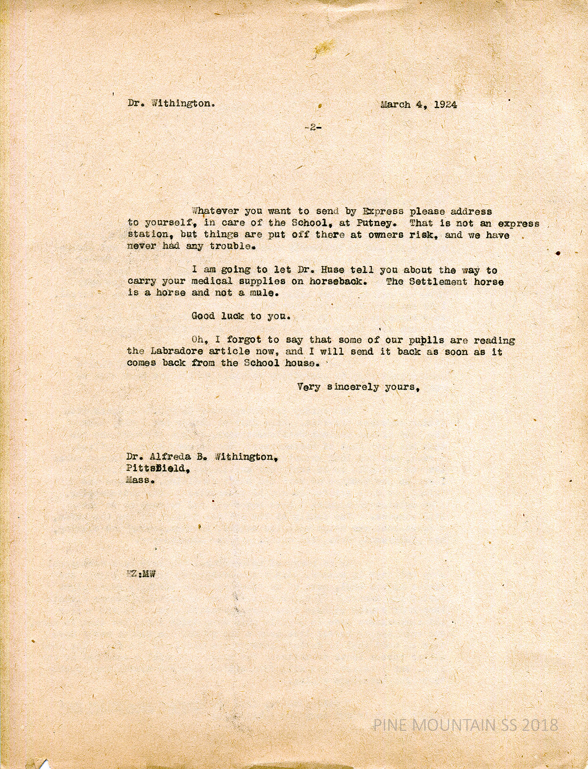 [withington_a_037.jpg] March 17, 1924. Carbon copy of unsigned 2-page typewritten letter to Withington from EZ (Zande). Answers Withington’s questions: (1) Describes best route to take. (2) At Laden she will be met by Mr. Wilson Lewis and his mule for the trip over the mountain. (3) “The dinkey can bring many trunks! They run a flat car for freight, and our new grand piano for the chapel came over safely before Christmas.” (4) “The trip over the mountain from Laden is about six miles. …” (5) “Yes, your mail address is [Pine Mountain, KY]. Someone from the Medical Settlement rides up periodically to get the mail.” (6) “Parcel Post is delivered at the school.” (7) Most local neighbors come to the doctor rather than the doctor making house calls. (8) and (9) Clothing tips. (10) The doctor would like to take in Pine Mountain once a week, …