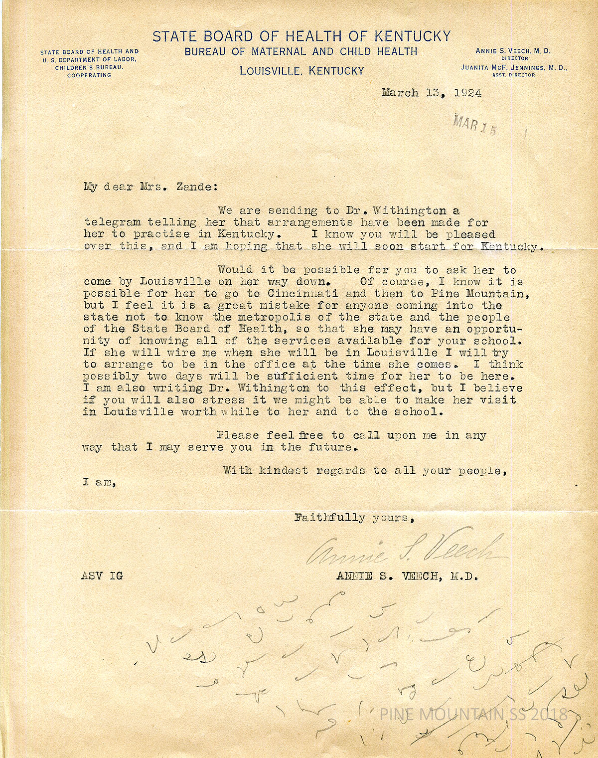 [withington_a_032.jpg] March 13, 1924. Typewritten letter to Zande from Veech. Informed Dr. Withington via telegram that “arrangements have been made for her to practise (sic) in Kentucky.” Asks for Withington to stop by Louisville on her way to PMSS in order to “know the metropolis of the state and the people of the State Board of Health …“