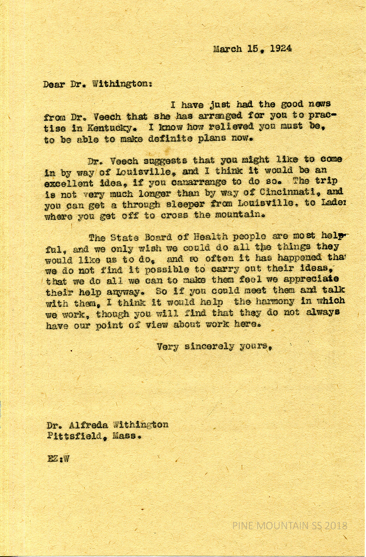 [withington_a_033.jpg] March 15, 1924. Carbon copy of unsigned typewritten letter to Withington from EZ (Zande). Informed Withington of Dr. Veech’s news and encourages her to visit Louisville en route to PMSS. “… [Y]ou can get a through sleeper from Louisville to Laden where you get off to cross the mountain. …[I]f you could meet with [the State Board of Health] and talk with them, I think it would help the harmony in which we work, though you will find that they do not always have our point of view about work here.”
