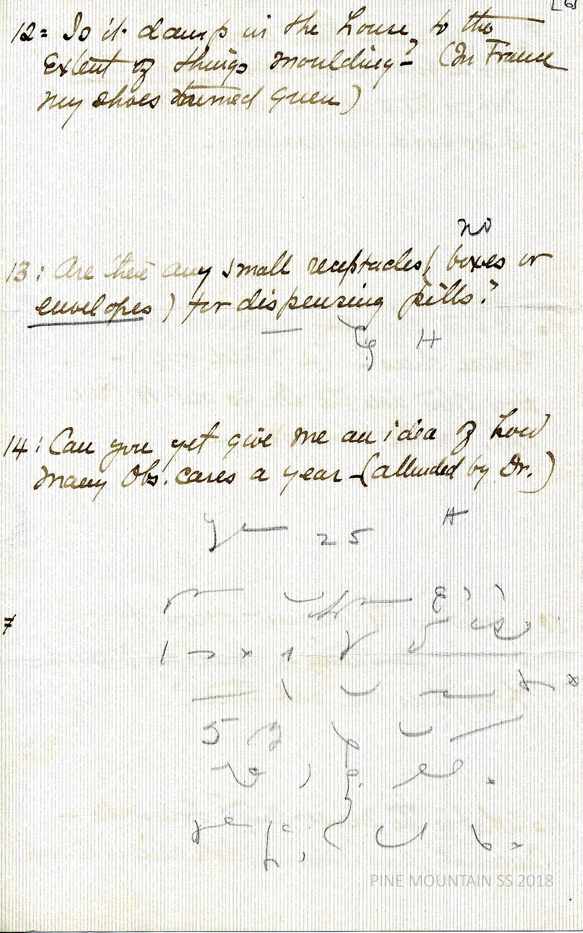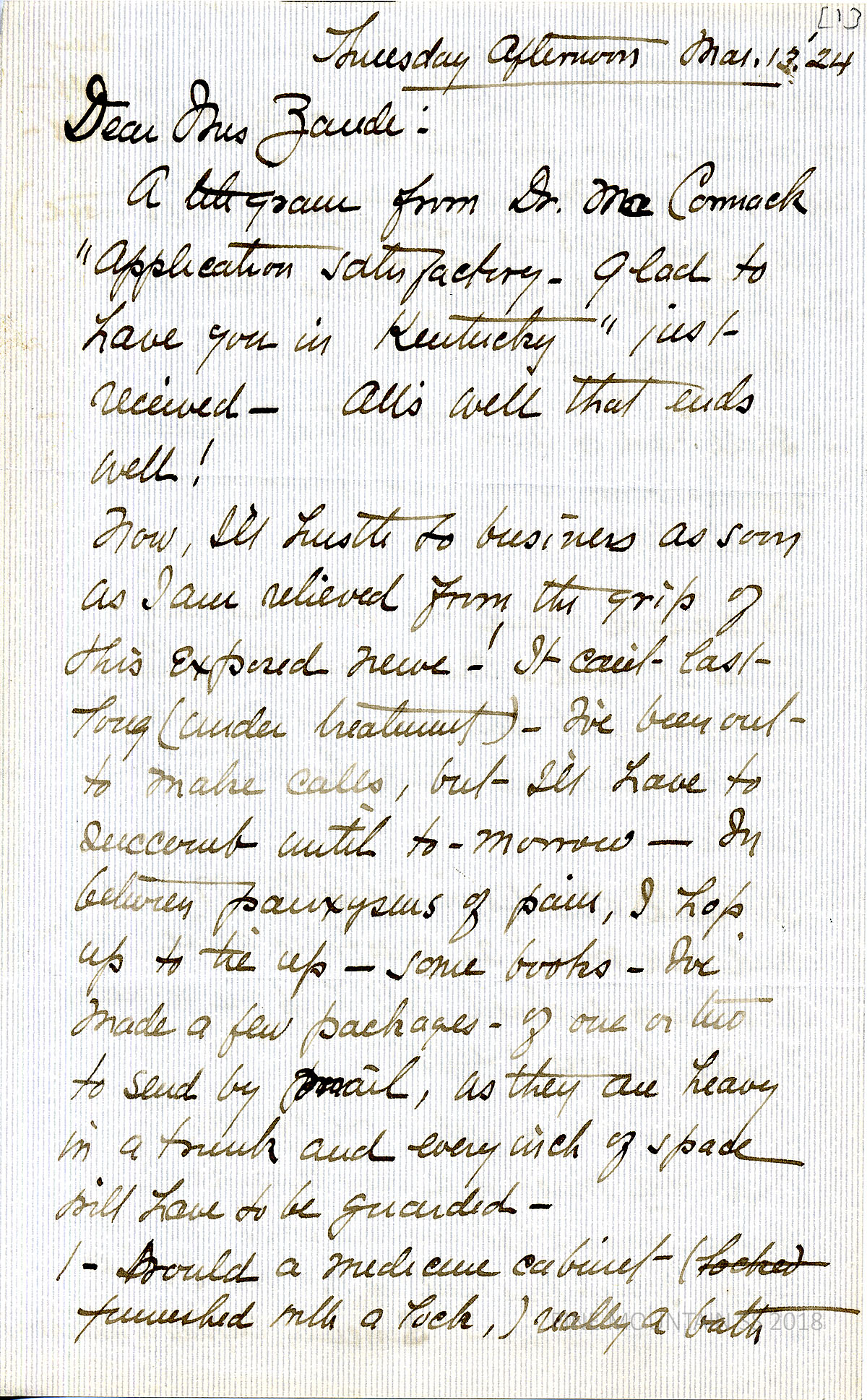[withington_a_035.jpg] March 13, 1924. Handwritten 6-page letter to Zande from Withington. Received telegram from Dr. McComack, stating, “Application satisfactory. Glad to have you in Kentucky.” Describes the pain she’s experiencing due to “exposed nerve” (tooth?) and her preparations for PMSS. [035a] Page 2. Asks about items she can bring or sell if not needed. Will need to learn treatment for hookworm. No housekeeper found; Met Mrs. Bell in NY. [029b] Page 3. List of questions about route to PMSS; arrival at station; how many trunks a dinky can carry … [029c] Page 4. … how to travel from Putney, her mailing address at PMSS, can parcel post deliver to PMSS, can calls be made on foot as well as horse? [029d] Page 5. Questions about clothing; nearest town and city; … [029e] Page 6. … dampness and mold, pill containers, number of obstetrician cases.
