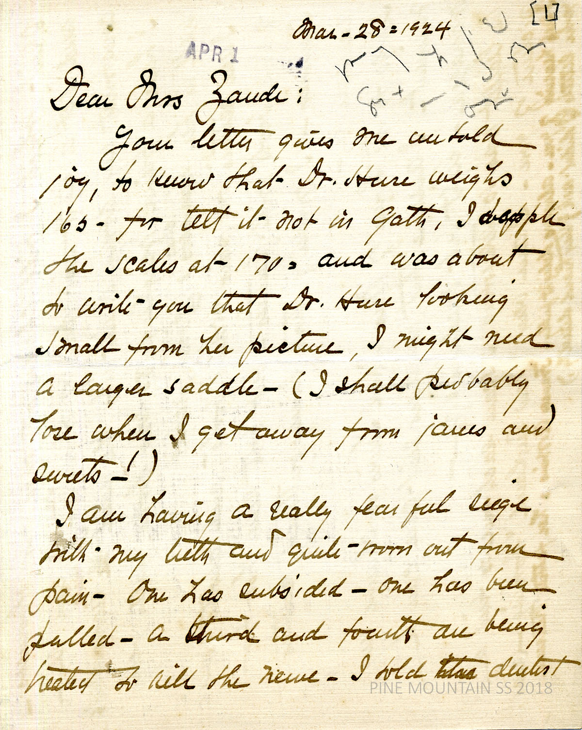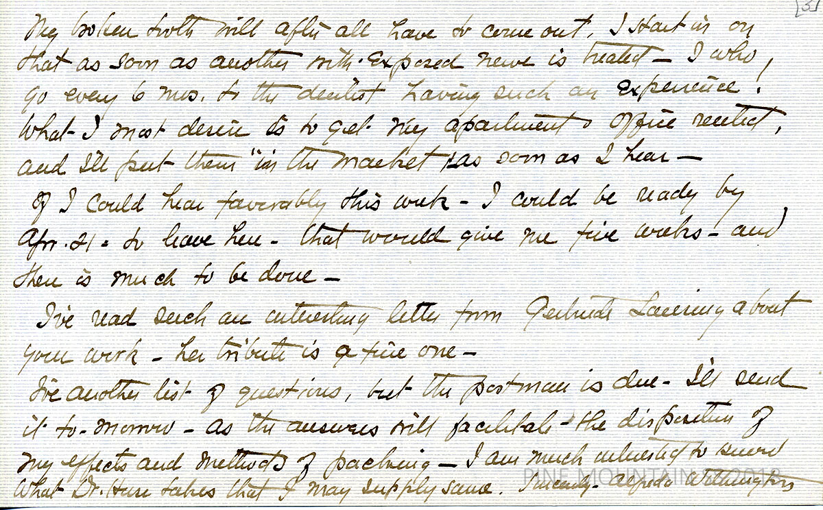 [withington_a_039.jpg] March 20, 1924. Handwritten 4-page letter to Zande from Withington. Comments on “being met by a mule” and the definition of a dinky. Agrees to stop in Louisville; more about her dental troubles; [039a] Page 2. Dental troubles, continued, which may affect her arrival schedule at PMSS. [039b] Page 3. Provides two possible dates for arrival and her arrangements with the Louisville people. [039c] Page 4. Writes about renting her apartment, the importance of talking with Dr. Huse, and clothing concerns. Visited Mrs. Bell in NY.