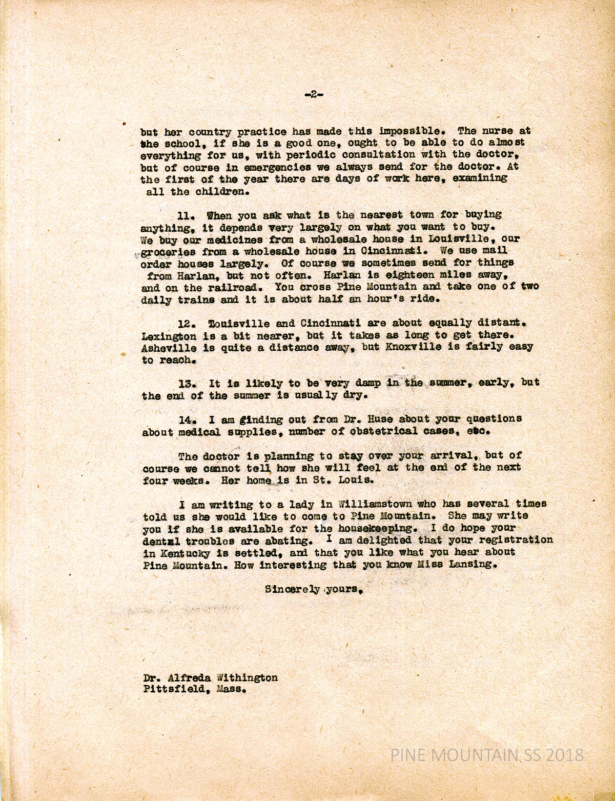 [037a] Page 2. …. But her country practice has made this impossible. [The nurse can fill in] but … in emergencies we always send for the doctor. At the first of the year there are days of work here, examining all the children.” (11) “We buy our medicines from a wholesale house in Louisville, our groceries from a wholesale house in Cincinnati. We use mail order houses largely.” Describes how to go to Harlan by train from PMSS (12) and distances from PMSS to other nearby cities. (13) Weather is damp in early summer, dry by end of summer. (14) Will ask Dr. Huse about Withington’s medical-related questions. The doctor (Huse) is planning to stay over your arrival.