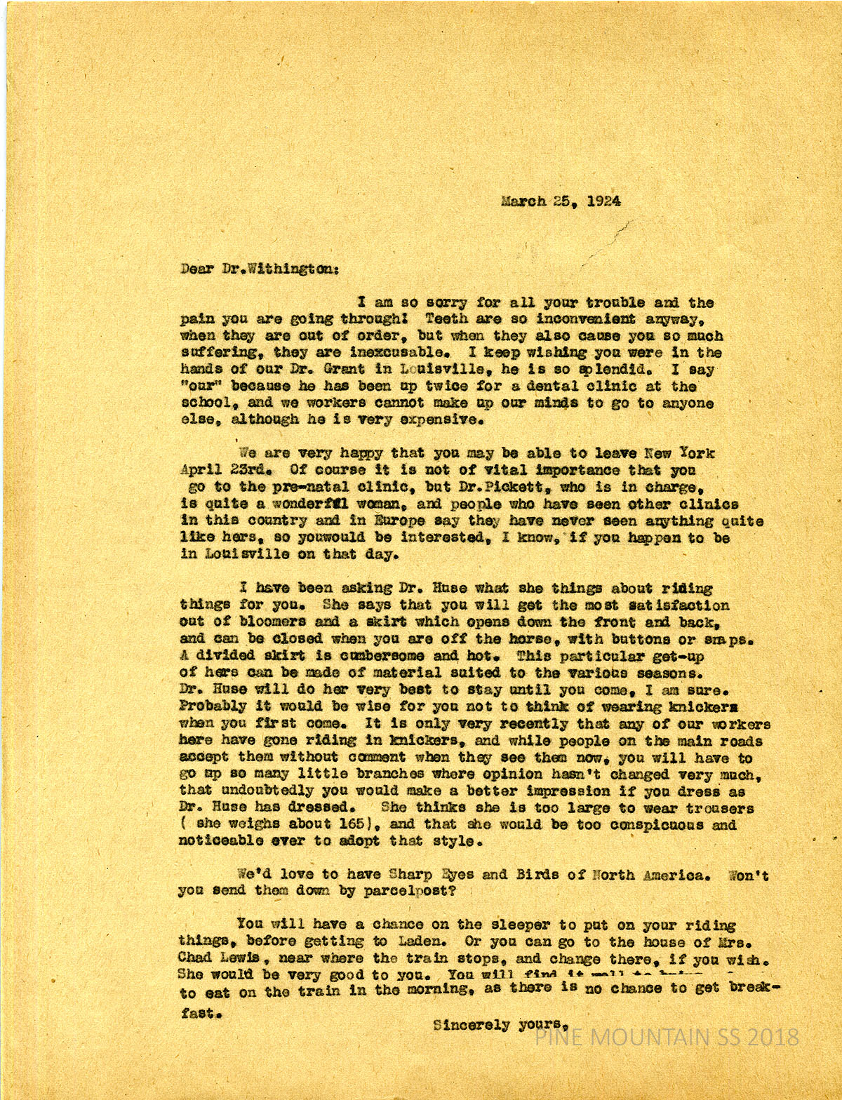 [withington_a_040.jpg] March 25, 1924. Carbon copy of unsigned typewritten letter to Withington from EZ (Zande). Mentions Dr. Grant, a dentist in Louisville who came twice to PMSS for a dental clinic. Hopes Withington can attend Dr. Pickett’s prenatal clinic in Louisville. Relays Dr. Huse’s suggested riding clothing; knickers may not be accepted up the branches “where opinion hasn’t changed very much. …” Accepts Withington’s offer of the books Sharp Eyes and Birds of North America. Gives advice about changing to riding clothes on the sleeper or at Mrs. Chad Lewis’s in Laden.