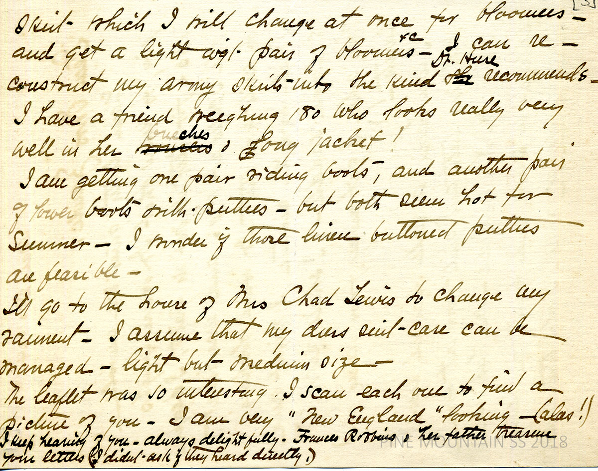 [027b] Page 3. [n.d., no salutation] Handwritten 2-page note from Withington. “Some off hand questions” Can she send things by American Express? What else to send besides things furnished by Dr. Huse and Miss Butler? Who lives at the Medical Settlement: nurse, teacher, housekeeper, doctor? Summer and winter temperatures? Need rubber boots? [027c] Page 4. “How is a medical kit carried, in a knap-sac? Is the settlement “horse” a mule or horse[?] (I’ve been reading Perry MacKaye’s article.)
