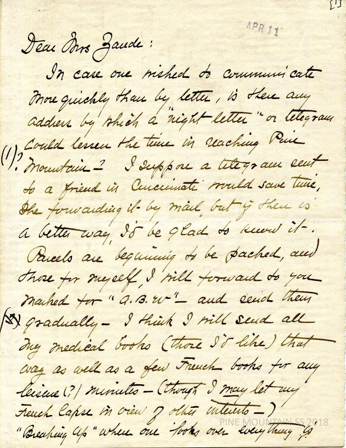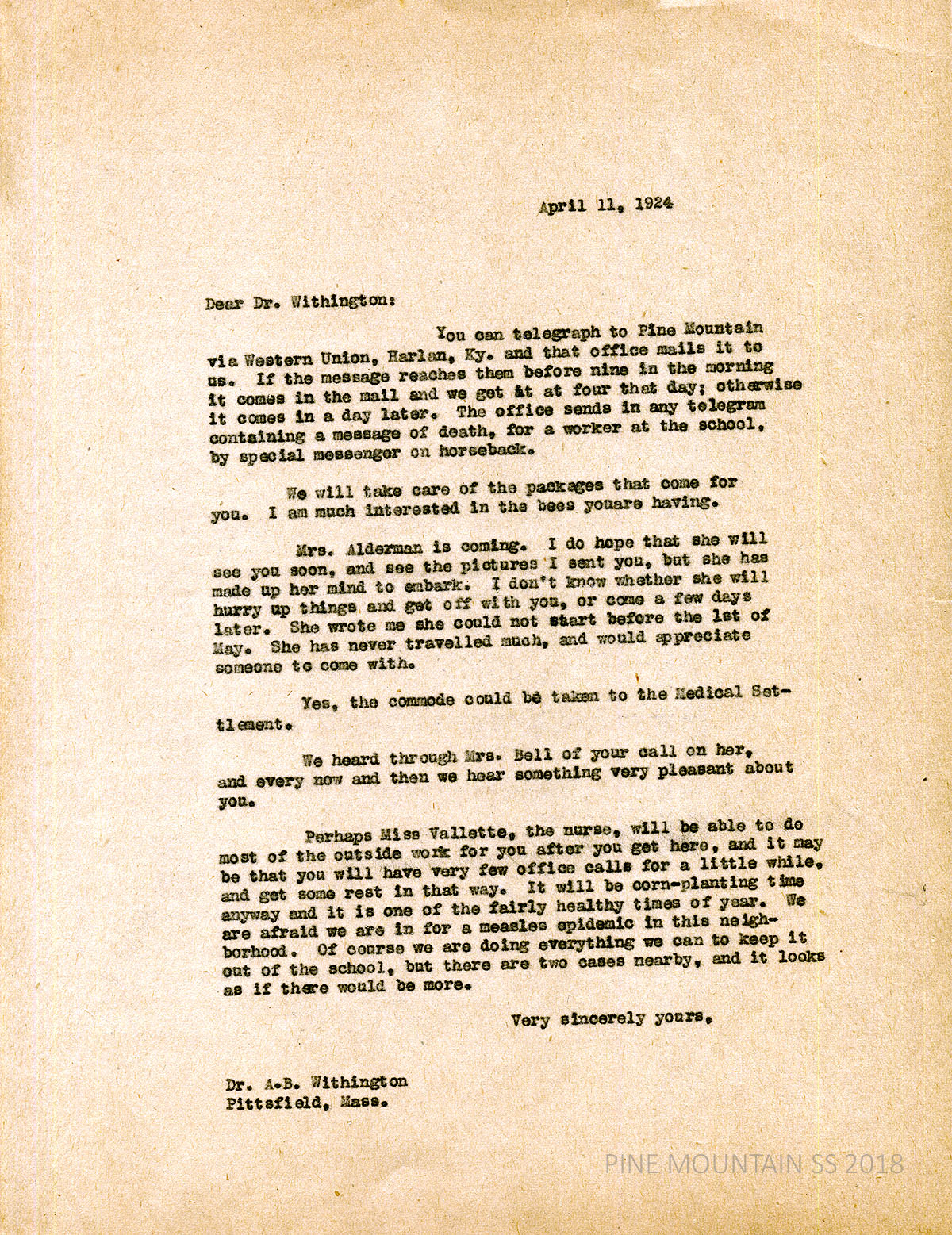 [withington_a_045.jpg] April 11, 1924. Carbon copy of unsigned typewritten letter to Withington likely from Zande. Use Western Union, Harlan, Ky., for telegraphs, which then mails messages to PMSS. “The office sends in any telegram containing a message of death, for a worker at the school, by special messenger on horseback.” Mrs. Alderman will be coming to PMSS. Assures that Miss Vallette, the nurse, may be able to do most of the outside work for awhile which will allow Withington to rest. “We are afraid we are in for a measles epidemic in this neighborhood. Of course, we are doing everything we can to keep it out of the school, but there are two cases nearby, and it looks as if there would be more.”