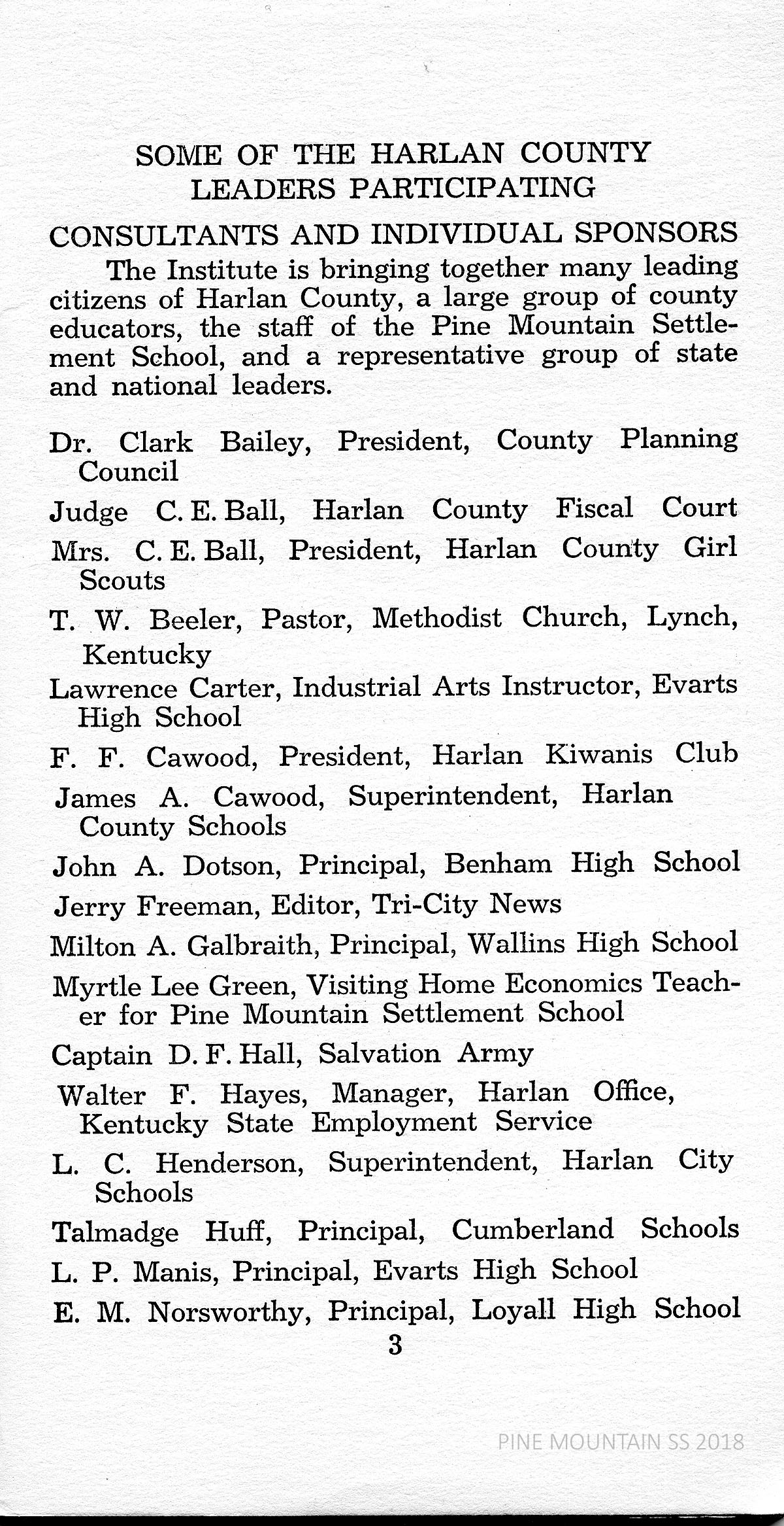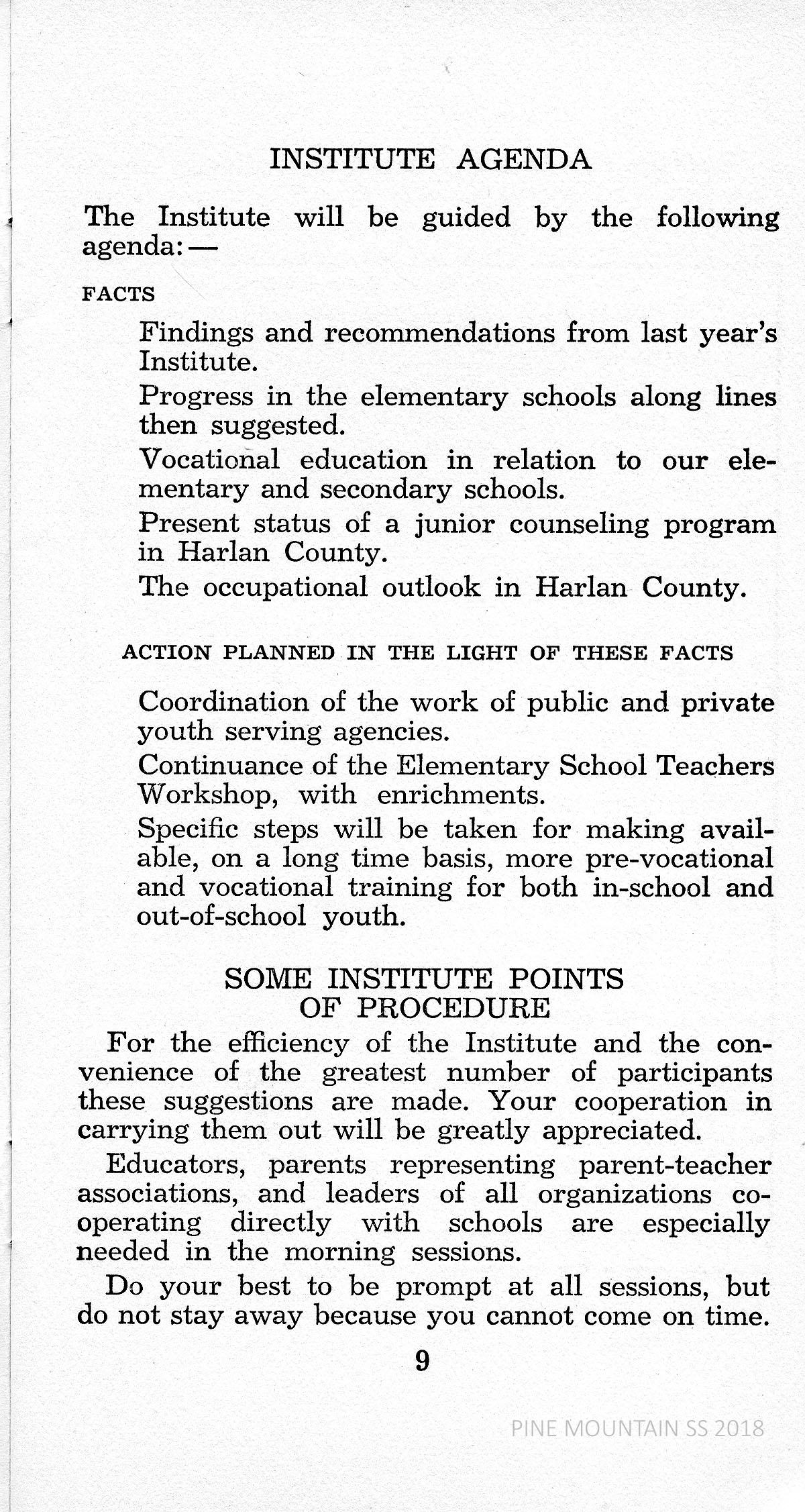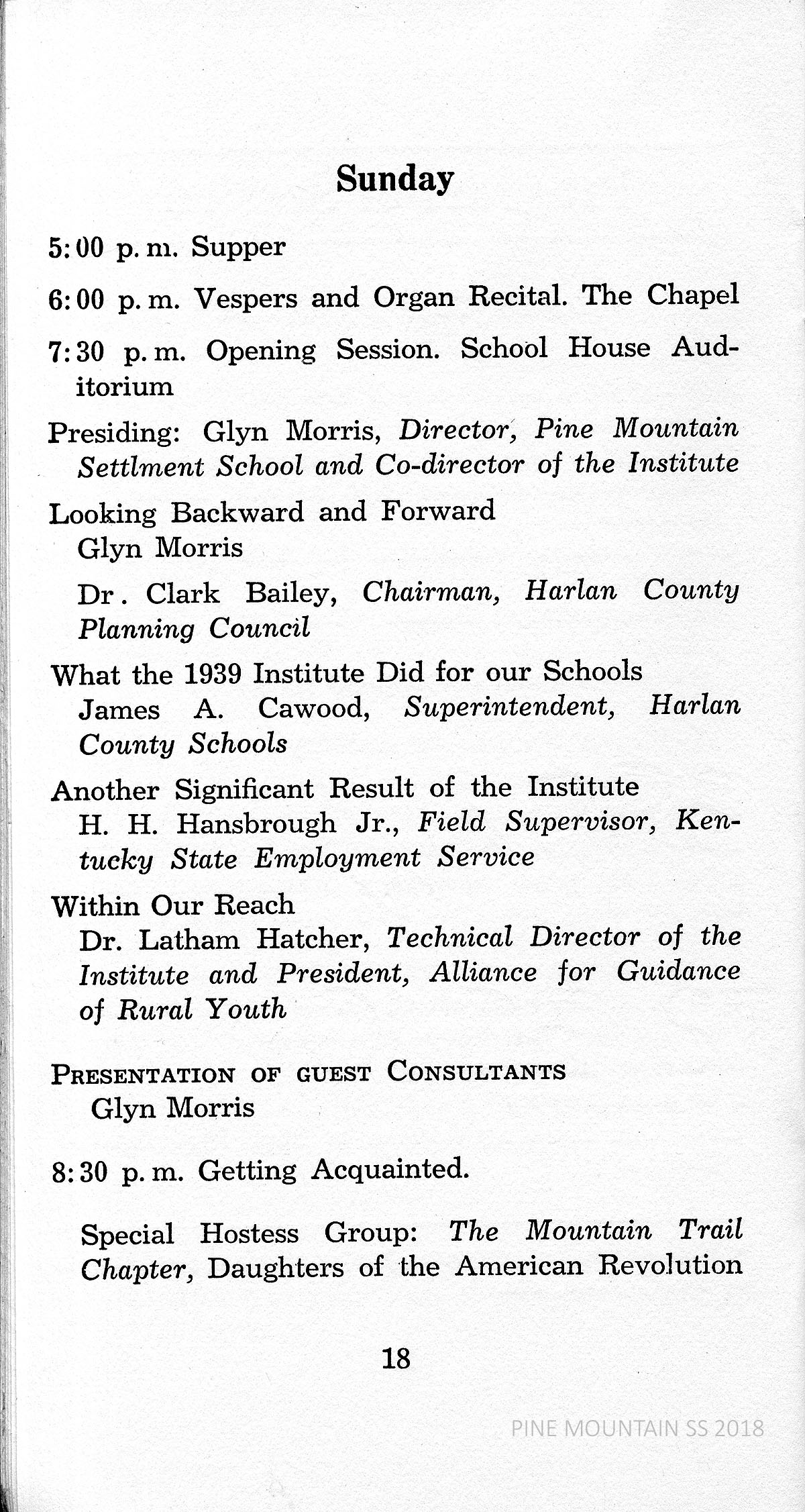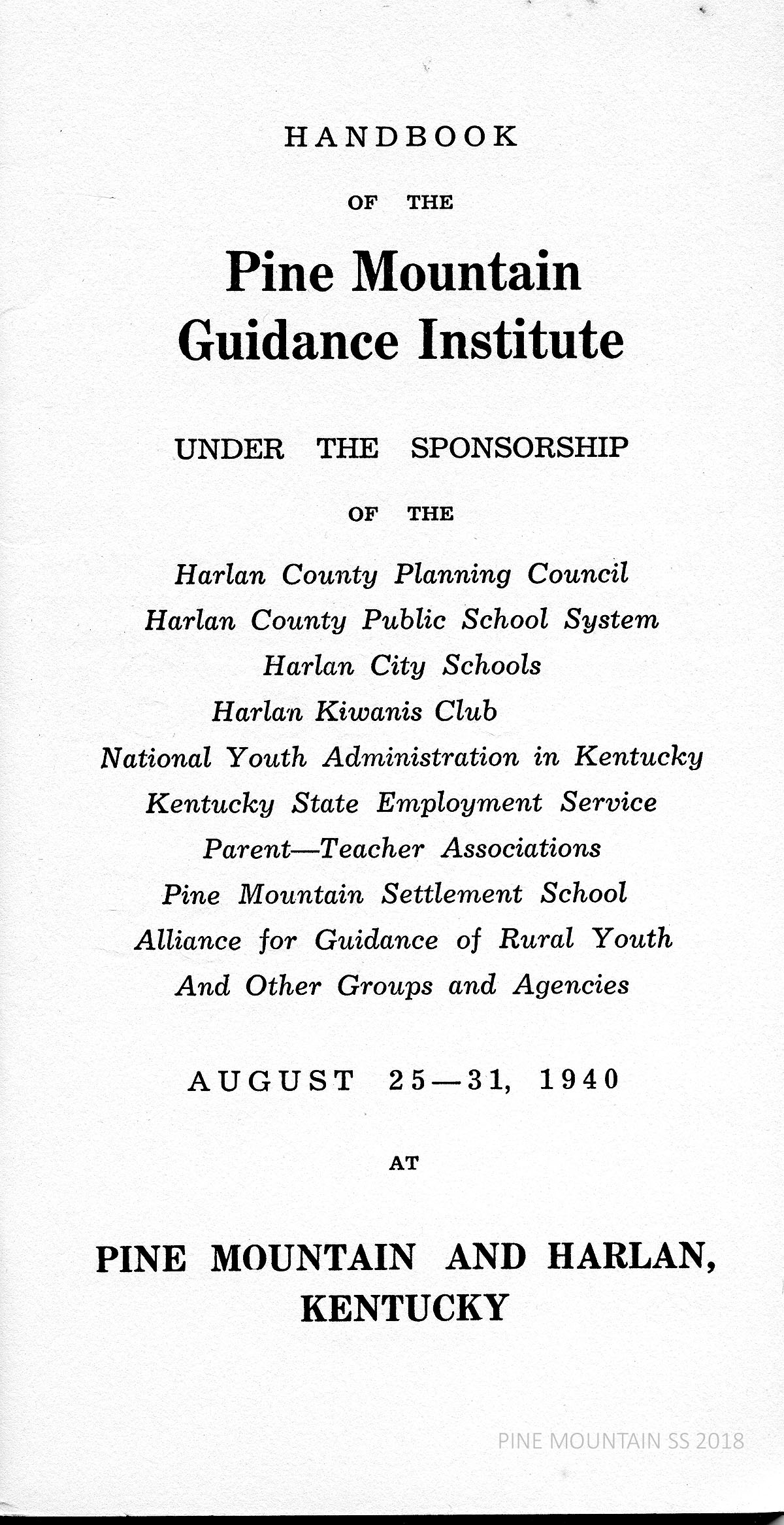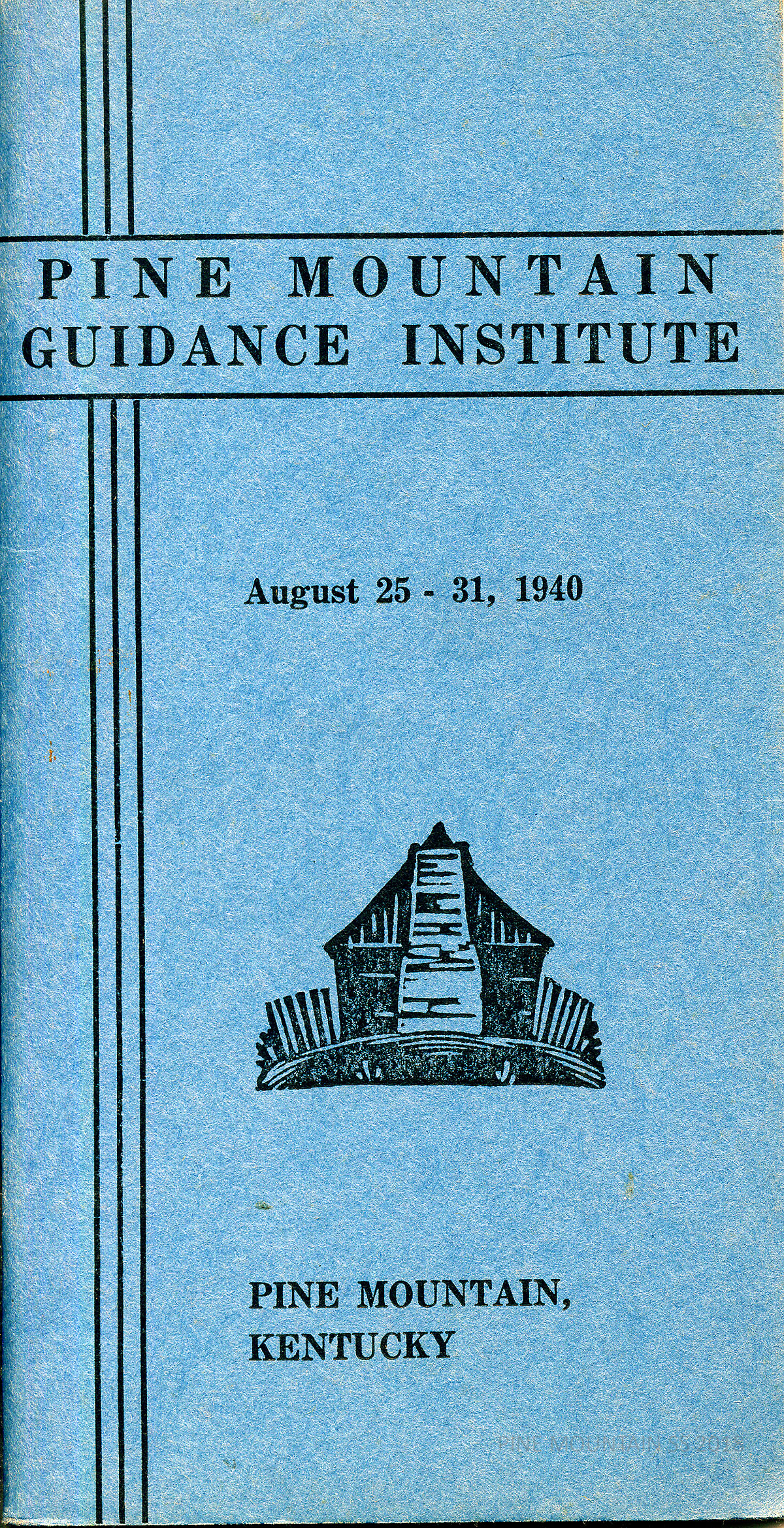 The 1940 PINE MOUNTAIN RURAL YOUTH GUIDANCE INSTITUTE was the fourth annual week-long meeting of Harlan County teachers, parents, ministers and other youth leaders. It was held at the Pine Mountain Settlement School where most of the earlier meetings had been located. The Alliance for Guidance of Rural Youth of Richmond, Virginia, sponsored the meeting.